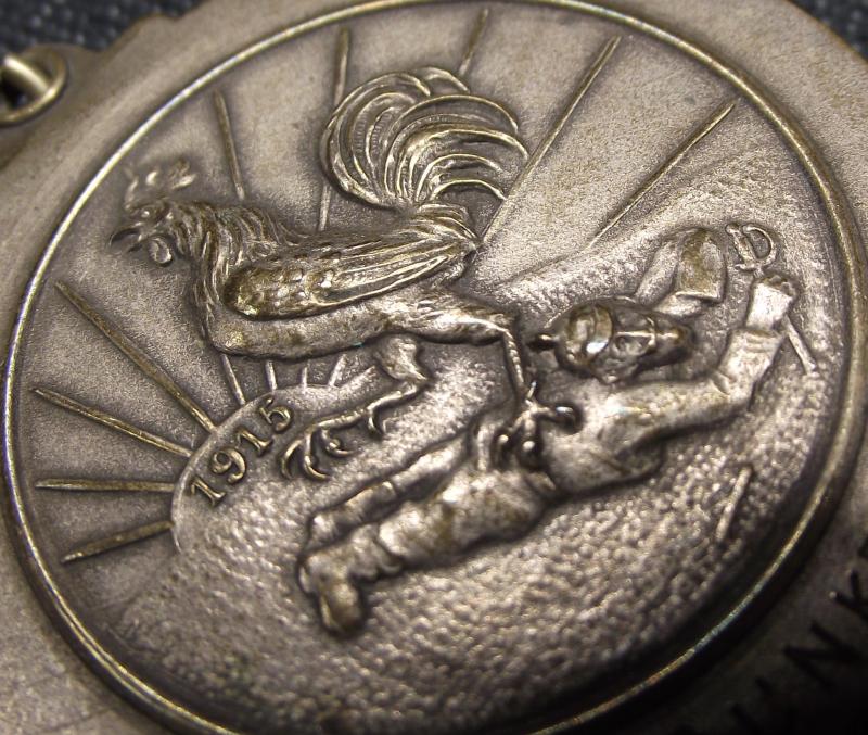 Nice small mirror to be worn around the neck produced during WW1 showing the Patriotic French Rooster on top of a vanquished German officer wearing a spiked helmet and holding a broken sword. Condition is very nice.