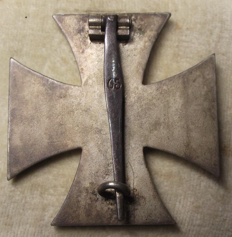 Nice condition set with the 65 marked cross having a tight two piece frame with dark areas from patina. The central iron core has close to 100% of its black factory finish, minor areas of wear to the swastika only. The rear has its period hardware, catch, hinge and pin associated with crosses manufactured by the K&Q firm including its code number stamp 65. The box again in very nice condition with little wear to the outside and strong Iron cross motif to the top. Both hinge and front opening button working fine. The inside is clean with the cloth hinge split.
