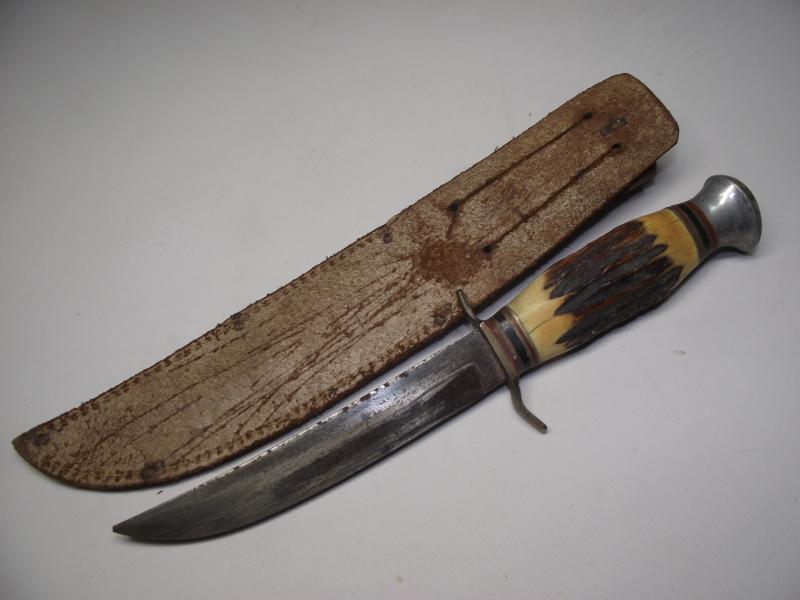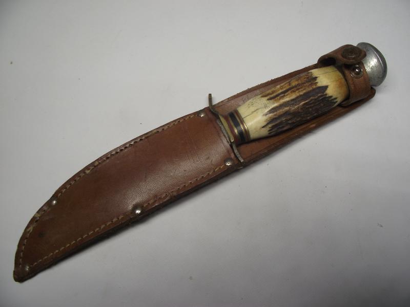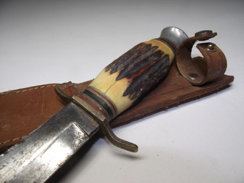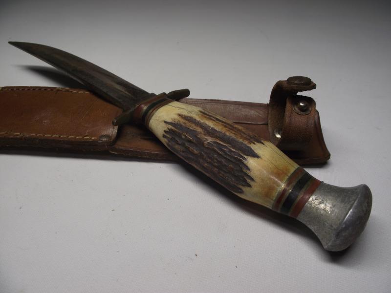 A nice vintage knife with a stained 5 inch blade without any makers details. The stag one piece grip has some minor cracking from age, all stacking rings are tight. Come with an ''England'' stamped supple scabbard.