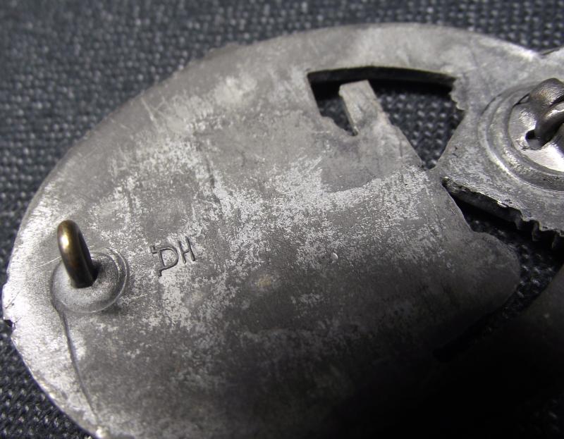 Badge has little wear to the detailed design and im going to say over 60% of its factory silver finish remaining. The rear has its period hardware and makers logo for the Aurich firm.