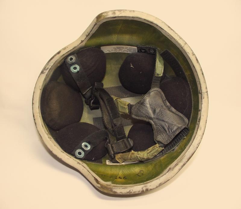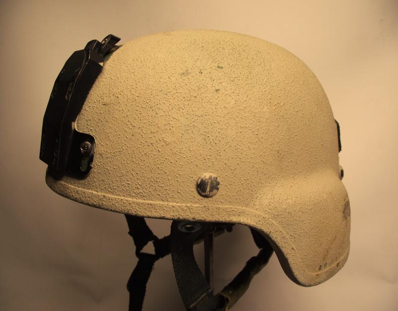 Nice TBH with tan finish added over the factory green with a night vision mount added to the front. The inside liner/chinstrap system is complete and in nice used condition. Helmet is marked ''Large'' on the inside label.