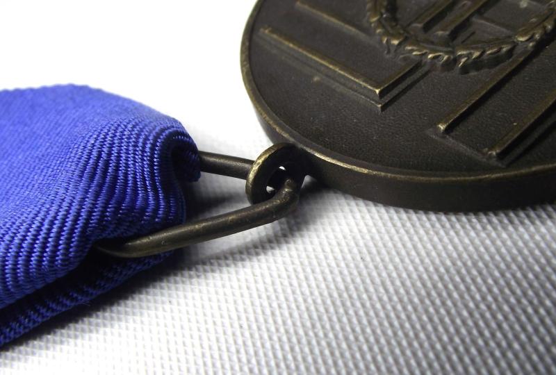 In very nice condition with close to 100% of its period factory finish, certain amount of wear to the high spots.Details are crisp. Medal has its tear drop suspension ring and comes with its period blue ribbon.