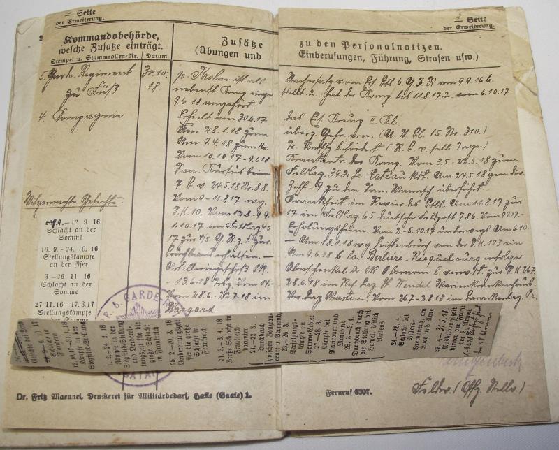 WW1 Prussian Guards Military Pass Book. Somme, Arras , Flanders.