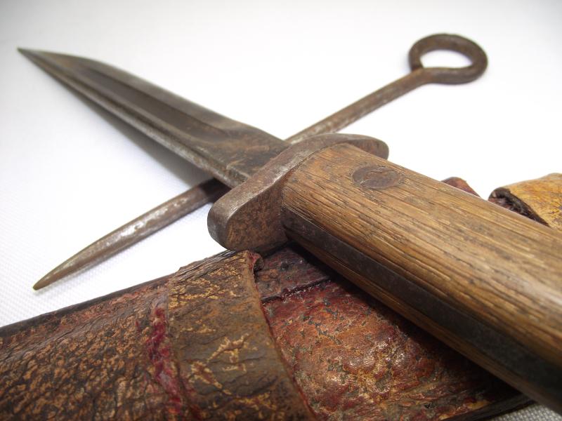 The bayonet was a WW1 Remington 1917 bayonet with the blade professionally ground into a sharp tipped fighting blade. The top rifle fixing ring has again been ground off and interestingly the grips have been replaced by two nice 1907 pattern bayonet grips. Additionally found in the scabbard is a converted pistol cleaning rod with ground down pointed tip, presumably another fighting tool. The scabbard is made from different pieces of the same pebbled leather, sewn and glued with one additional pouch to the front top, now empty.