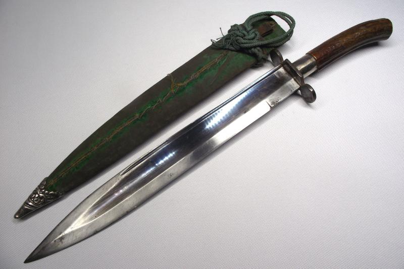 A very nice Indian made Bowie knife with a just under 12 inch blade. The blade seems to have started its life blued losing most on the high spots, nice fuller running along the top. The cutting edge and tip has seen some period sharpening as expected from a used item, no makers stamps. The hilt has a good amount of finish remaining with the stag horn handle in very nice undamaged condition. The knife has a very nice balance and light in the hand. The cloth covered wooden scabbard is complete with its bottom decorated chape and as seen in the photos when first produced had a dark green finish to the material, now gone from use.