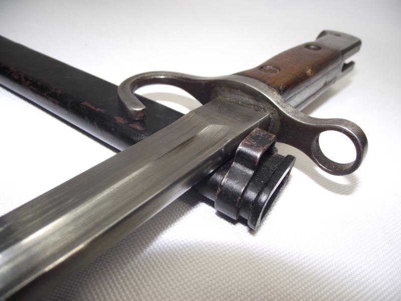 A very nice condition bayonet with the blade being bright without staining or toning and a clear factory stamp. Hilt has some of its period finish leaving a very clean finish with no pitting and minimal staining, top fixing button moves with the slightest of touch. End of the pommel has a five digit number, 38281. The wooden grips have no chips or cracks, only minimal staining from use. The steel scabbard has close to 100% of its period black finish with just a touch of wear to certain points. It has been noted that black painted scabbards might well indicate naval use. All in all a very good example.
