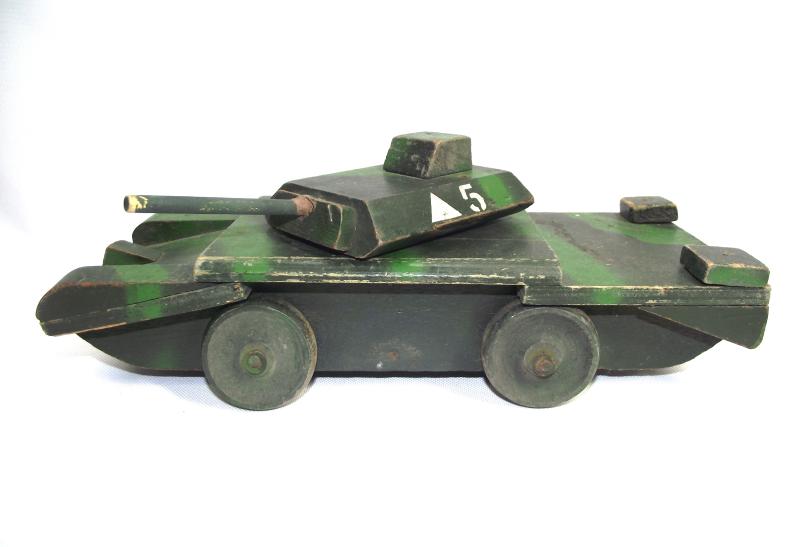 A very nice toy tank with very nice period paint remaining, some wear and scuffs from plenty of use , please check the paint loss to the wooden wheels. Turret swivels on a wooden peg. Toy measures 12 inches in length by a width of 5 inches.