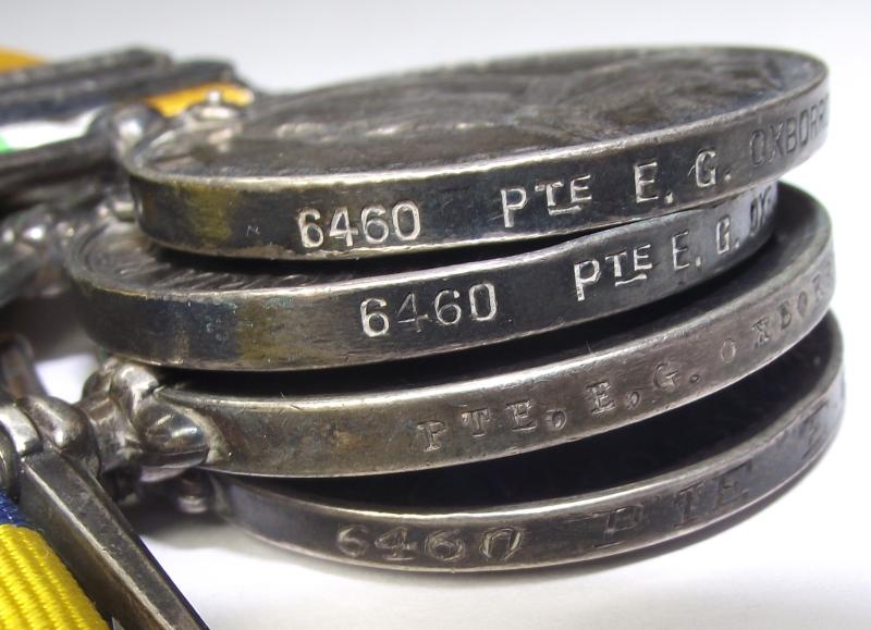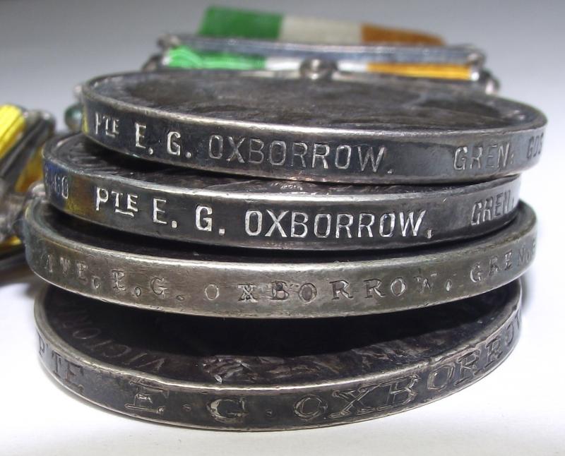 Medals are unmounted and have taken on a nice dark patina with some minor scratches and edge knocks. All medals are made out to the same recipient..6460. Pte E. G. OXBORROW, GREN,GRDS. It would seem that the Khedive's Sudan is missing its Khartoum Bar. Oxborrow, from Suffolk, a horseman, signed his papers in 1897 and was discharged in 1909.
