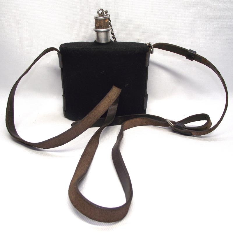 Ok so let me be honest, the title above is an opinion i have only, as i cannot find an example anywhere. It does have a feel of a WW1 period example with black felt body and the leather hanging harness, no stamps etc to be found. As for condition i would say its very good with some minor moth tracking only to the cloth cover , no dents to the body. Leather harness is supple and complete with all four leather fixing straps to the cloth in sturdy condition. The actual size of the body without taking the spout into consideration is around 5 x 6 x 3. So even without me being able to put my finger on use, other than carrying water, im inclinded to suggest its an interesting piece!