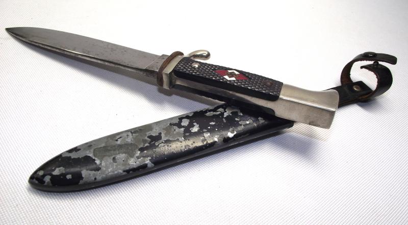 In very nice condition as seen in the photos. The scabbard is the post war zinc moulded type. Two HJ daggers where brought in to me yesterday, the tiger example being a ''no brainer'' original, this Hubertus had me scratching my head as i had not come across this maker before and the knife itself matches closely HJ daggers made during the period. Thankfully i had internet connection so with a little due diligence i found reference to the Hubertus firm making scout knives in the 30's and then the 50's but did not produce any HJ knives with this trade mark with ships wheel. Perfect for a reenactor or display if your not wanting to pay £450 up for a period example.