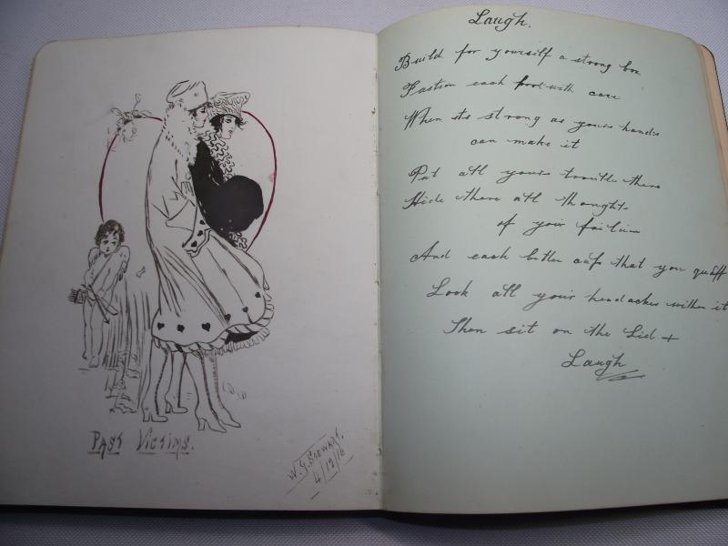 In very nice condition with some very nice drawings found inside and some written sentiments, all are dated from WW1. I may add that this book has lots of empty , unused pages with just a few more than i have photographed as this would not appear to be the usual ''nurses'' example that are usually found completely full with the sentiments of wounded troops in Hospital.