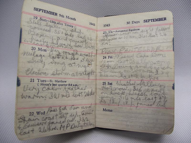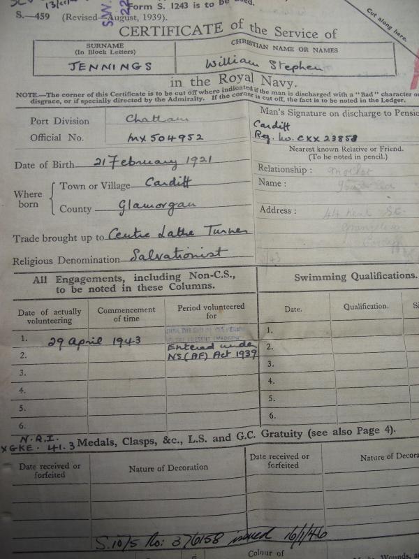 William Jennings from Cardiff enlisted in 1943 and served on HMS Resource till the end of the war. Resource was a fleet repair ship that served in the Pacific from 1943. The box has Jennings details to the front under the staining and includes his four medal entitlement including the Pacific star and a Burma clasp. The diary included with the group has just a few pages filled with information mainly relating to the journey Jennings took from the UK to Alex in North Africa and his travel through the canal. Its interesting that the crew where not allowed to disembark at Suez due to the Plague! This little group i purchased off the daughter last week so is new to the market!