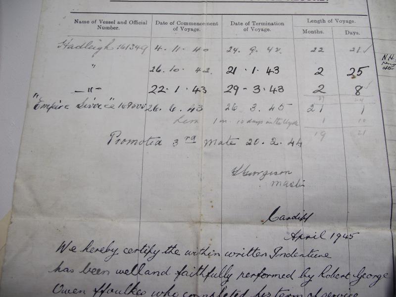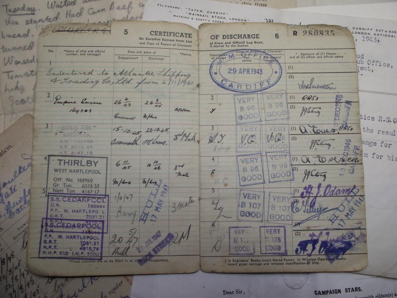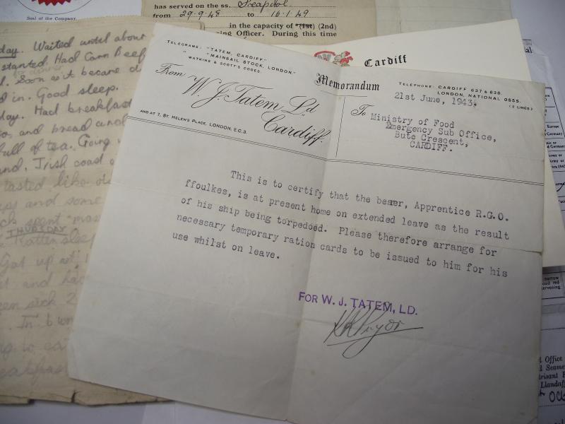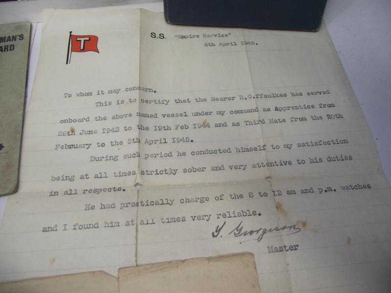 A very nice large grouping of paperwork and medals belonging to a R.G.Owen.FFoulkes from Newport Road, Cardiff. From what i can gather, FFoulkes signed his Apprentice Indenture with the Atlantic Shipping and Trading Company Ltd in 1940 serving on his first ship SS.Hadleigh. FFoulkes was on board the Hadleigh , part of convoy ET-14, when it was torpedoed and sunk with the loss of two crewmen by U-77. This sinking is mentioned in a couple of documents. FFoulkes then served his remaining wartime service on the Empire Service, one of the Empire class Merchant Vessels run by the MoWT. As with many ''Salts'' this merchant seaman carried on from ship to ship after the war, passing his Steamship Master Certificate in 1955 ending his service in the 1960's as a Captain. There is too much paperwork relating to his service during and after the war so im not going to be able to list it all but heres a small preview.. Apprentice Certificate, wartime and postwar record books, Master Certificate, letter from the Master of SS Empire Service concerning his time on board, letter for addition of ration cards after being Torpedoed and two hand written letters i think written by FFoulkes pre war when working at sea. His large group of mounted medals come with a photocopy of his entitlement including certificate for the Coronation Medal. I myself think this is a super group with plenty of research possibility and something that came my way from a friend who does local house clearance so new to the market and never in anyone's collection before!