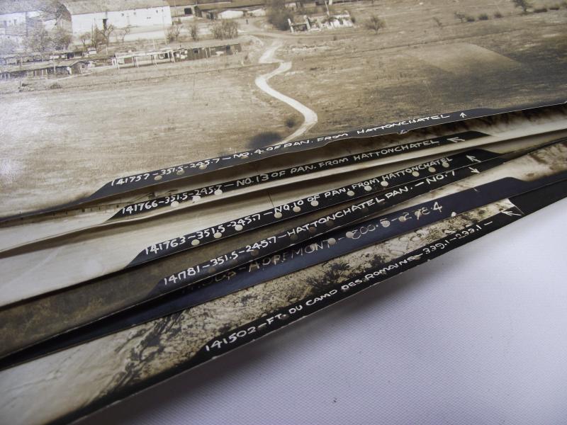 Its my belief this large photos where taken in 1918 by the allies before the offensive to liberate the surrounding area to eliminate the St.Mihiel Salient. The area was capture by the 26th ''Yankee'' division on Sept 12th 1918. Four photos are marked views from Hattonchatel, i think its views of the Woevre pain. The other two are titled Apermont and lastly an aerial view of Fort Du Camp Romain that was capture by the Germans in 1914. Condition of the photos is very good with slight edge knocks etc.