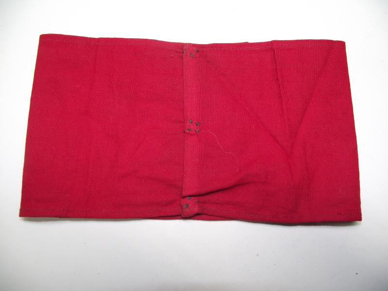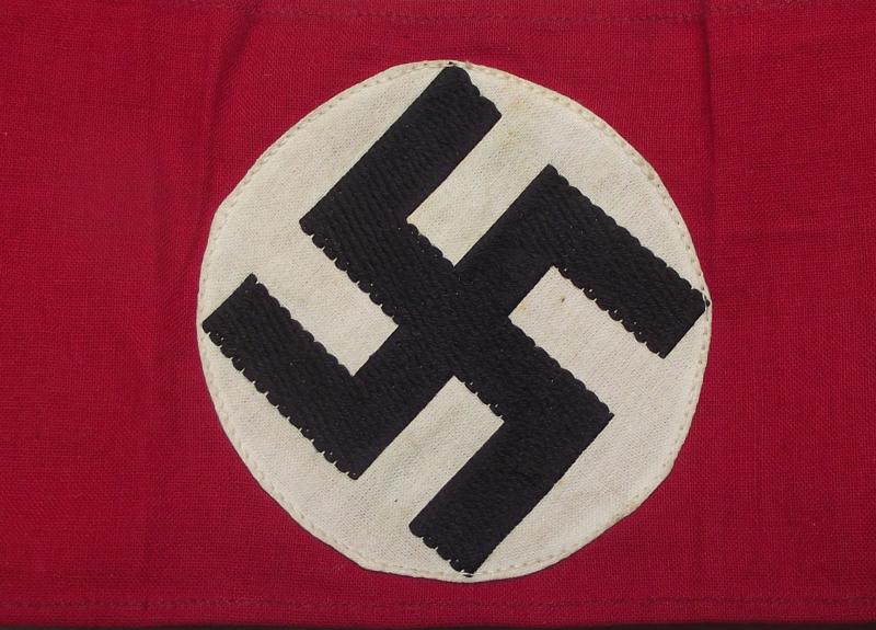In nice used condition with a Bevo type swastika on white roundel stitched to a filed of red cotton material with its edge folded and machine stitched into place. This example has snap buttons to the back for fitting to the uniform. I have and will not try and open the snap buttons as they all appear to have not been open for a number of years.