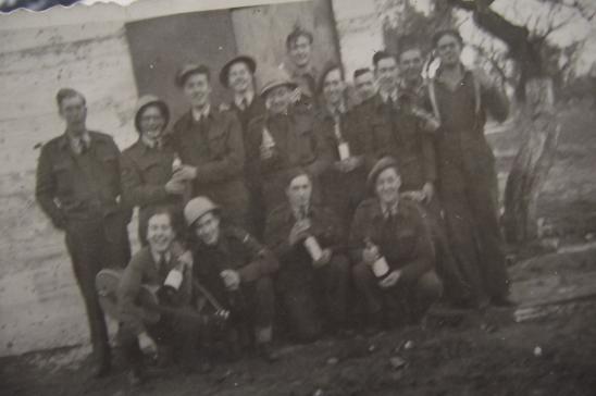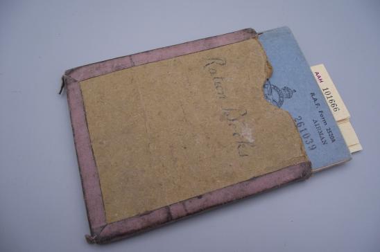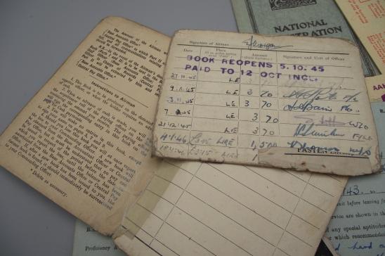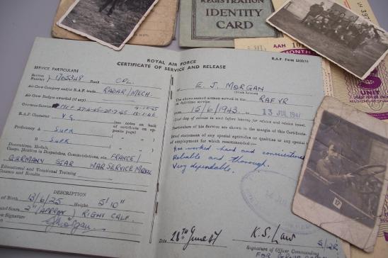 Small lot that once belonged to Radar/Mech Cpl Morgan off the RAFVR. Group has his release book, paybook, ID card, Ration booklets and his wife's ID card. One of the three photos shows Morgan with his buddies most likely at wars end having a celebration with bottles of ''plonk'' and some are wearing captured headgear. All wear found in a home made ration folder.