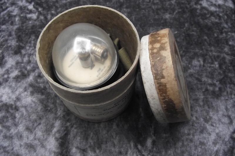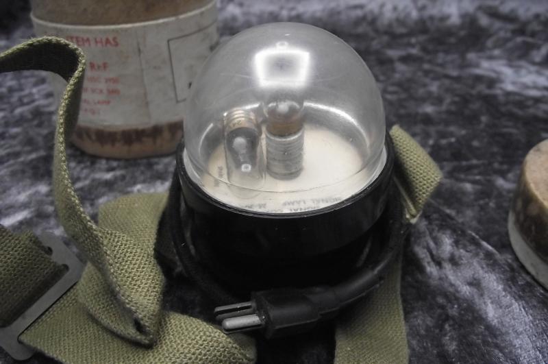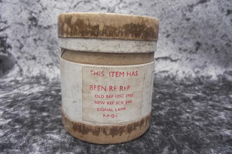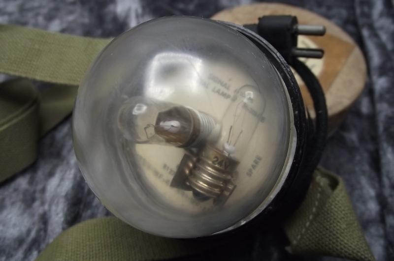 A wartime US produced signal lamp still held in its storage container with a RAF stores label to the lid. Condition is very good.