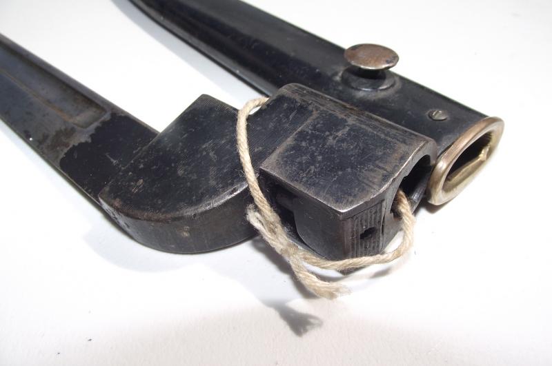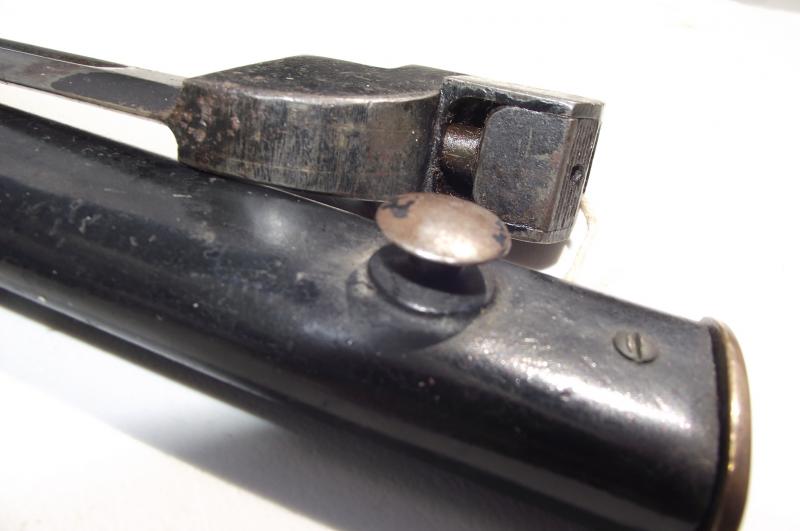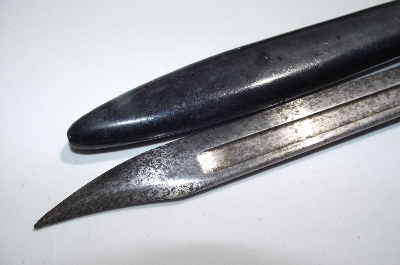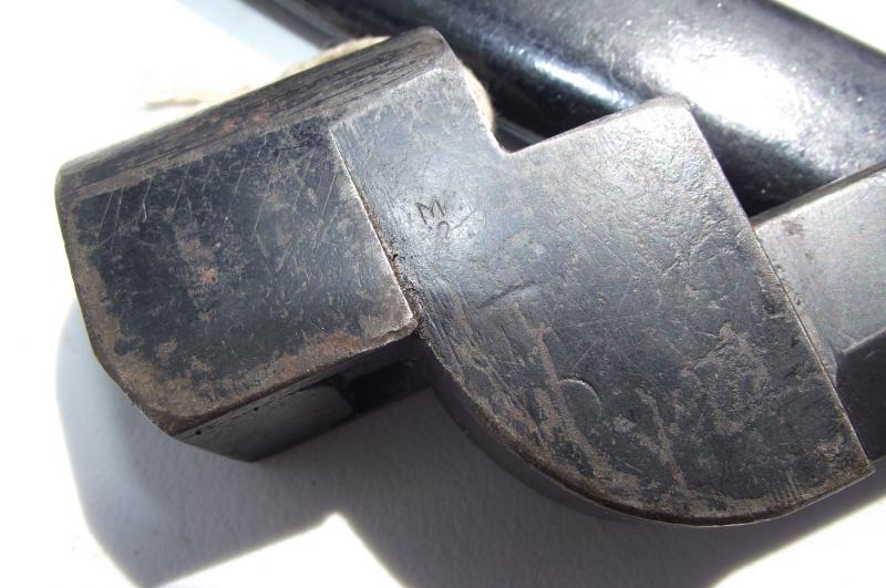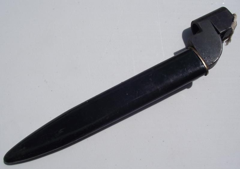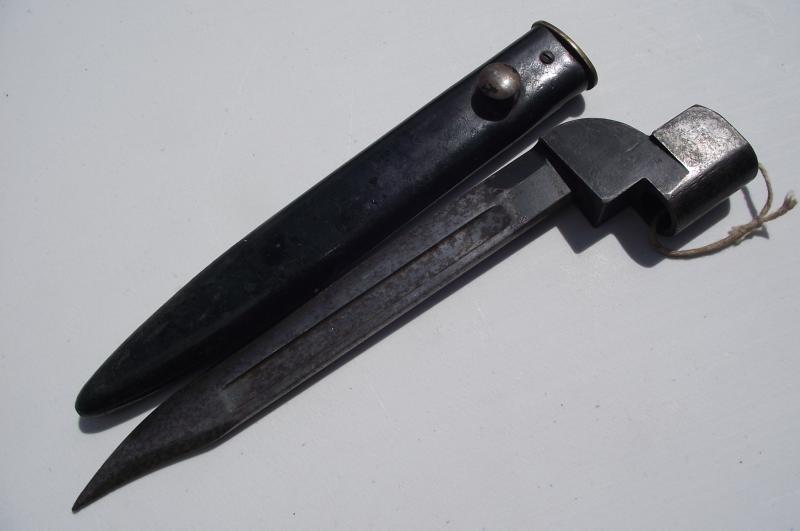 Good condition bayonet with the blade having a good tip, one side of the blade has staining with the factory finish running from the pommel to the top of the blade. Fixing spring works. The top front of the handle is clearly marked M-49 and i can clearly see a letter ''M'' stamped to the side. The steel scabbard is free from dents has nearly all its finish and its top throat is made of brass.