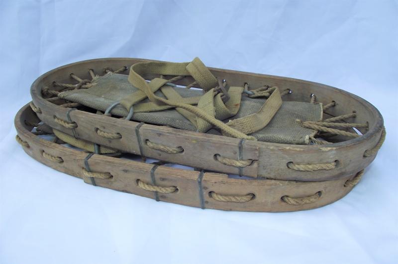 A nice matching and complete set of British rope snow shoes with both sets of straps being marked for the Bagcraft firm and dated 1943. Both wooden frames are stamped with a broad arrow over a letter ''W''and ''3''. One foot webbed pad is also marked with a broad arrow and the letters R.S.&C.
