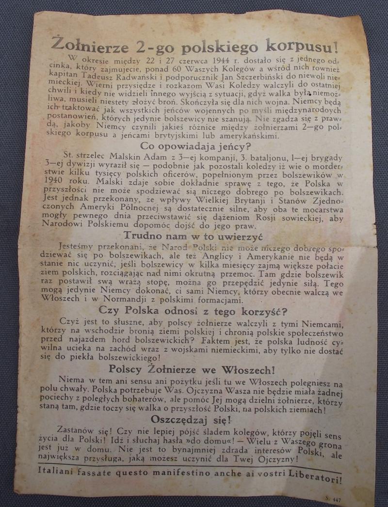 Italian Propaganda Drop Leaflet. Polish Forces.