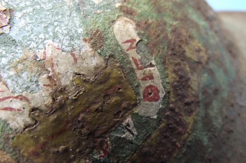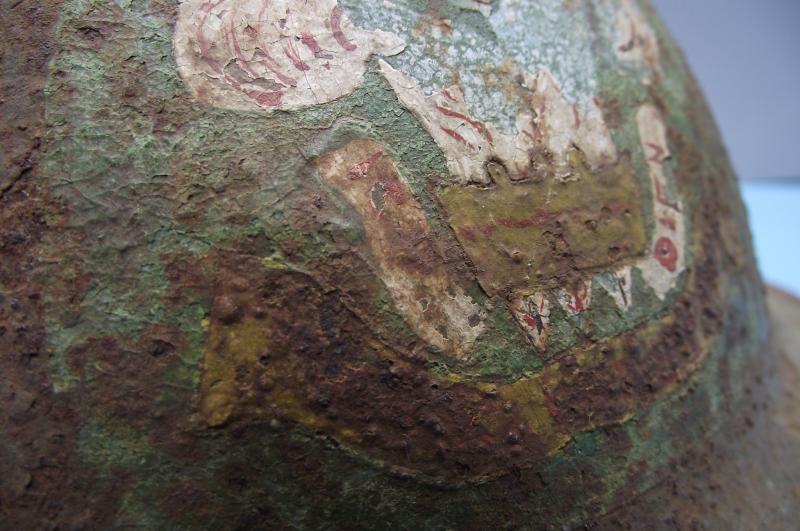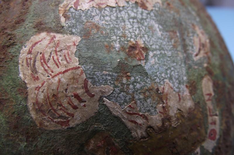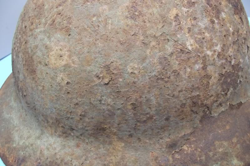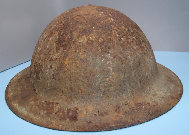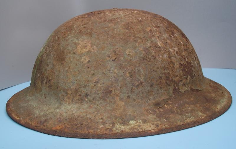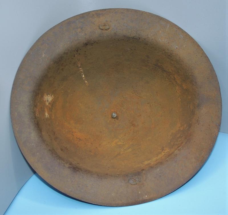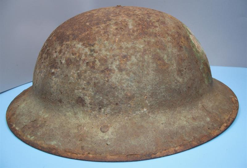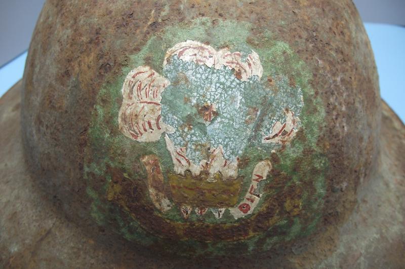 In relic condition with close to 50% of its period rough finish intact. To the front is a period hand painted Welch Regiment insignia in a large shield. Id say its close to 40% complete. The shell has no dents and is in solid condition. The inside has lost its liner , clear makers details can be found to the front inner skirt, MLS 35. This example might well be a ground dug item or badly stored for over 100 years in damp conditions. Recently found in the South Wales area.