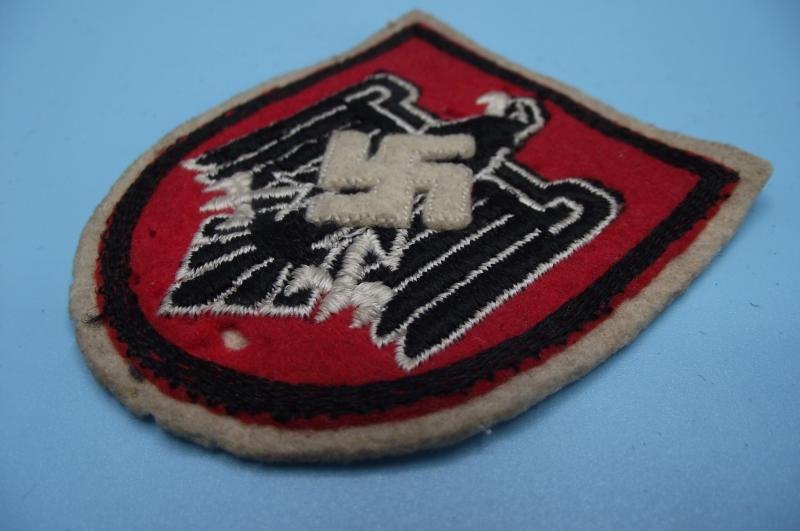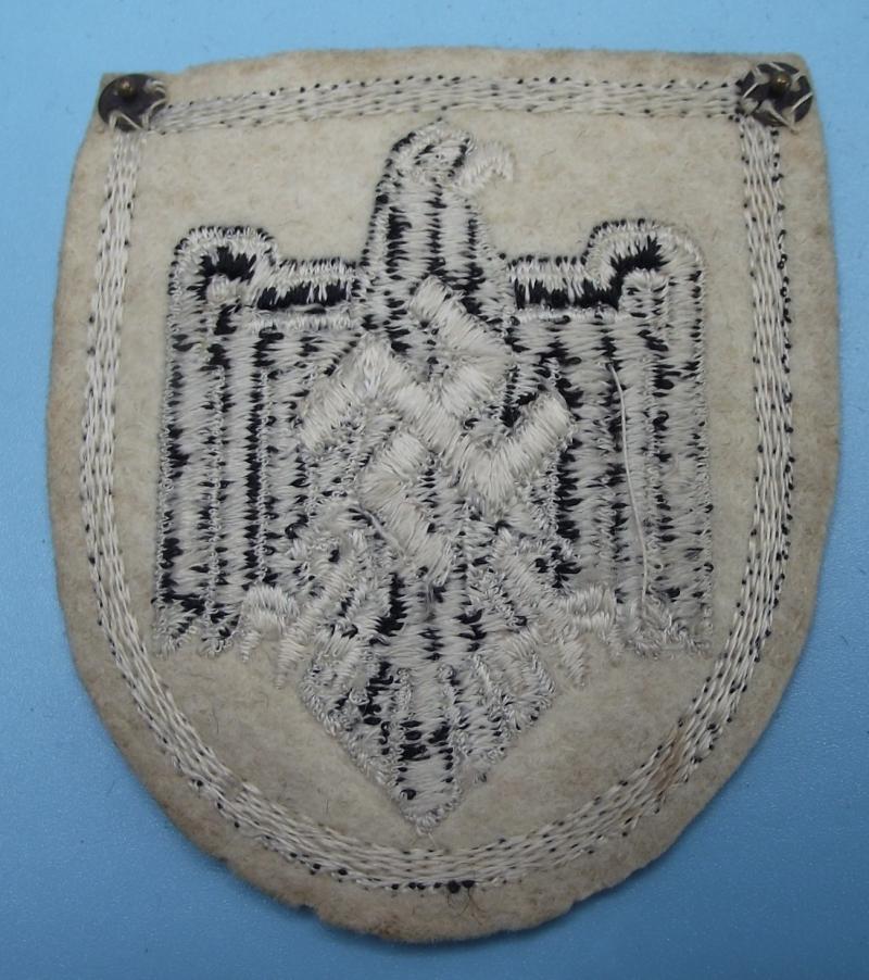 As used during the 1936 Olympics by NRSL participants . Multi piece shape shield shape that's in very nice condition with just a couple of moth nips to the red material. The rear has two fixing poppers for easy removal from the uniform.