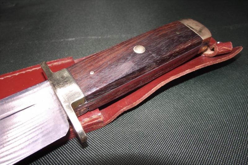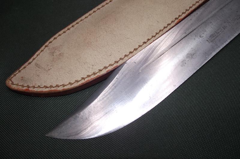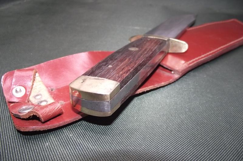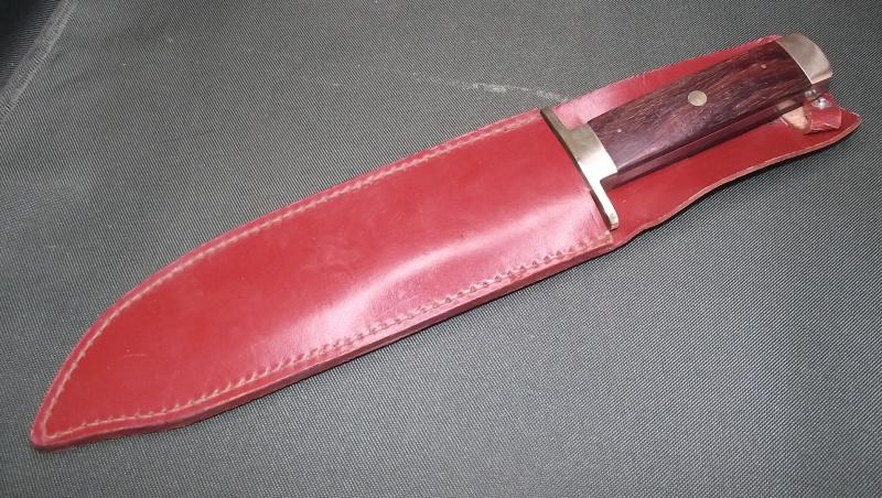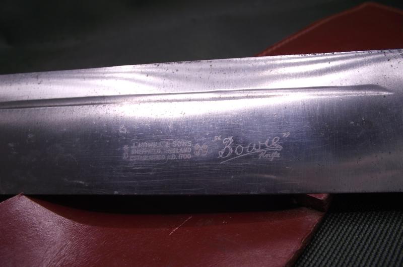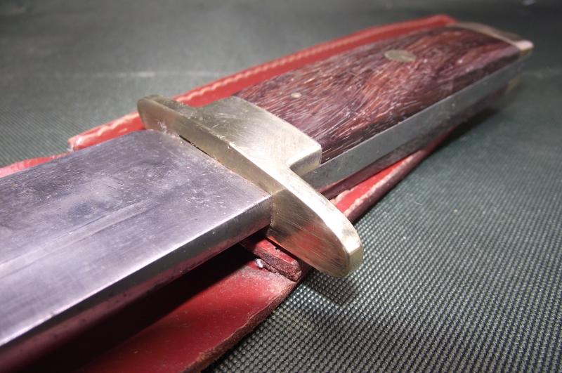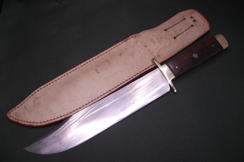 Nice large Bowie knife made by the firm Knowill and Sons. The blade has minimal staining, seems to have been clean to one side. The brass cross guard and pommel are in very nice condition as are the two wooded slab grips. Leather scabbard is supple with tight stitching, top working strap and is marked ''England''. Overall length from pommel to blade tip is 15.5 inches.