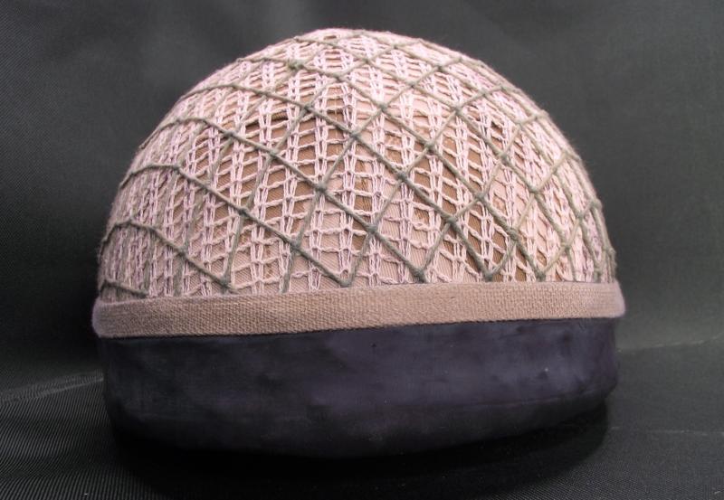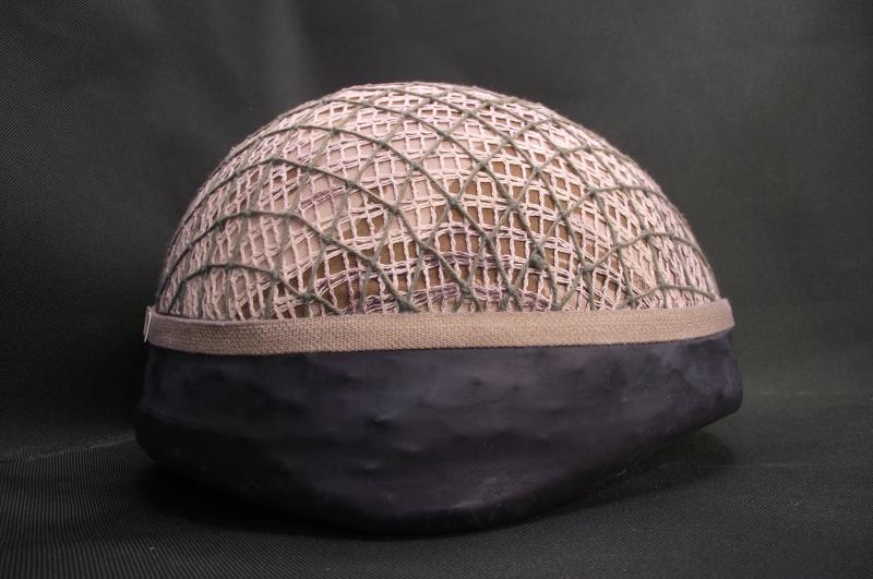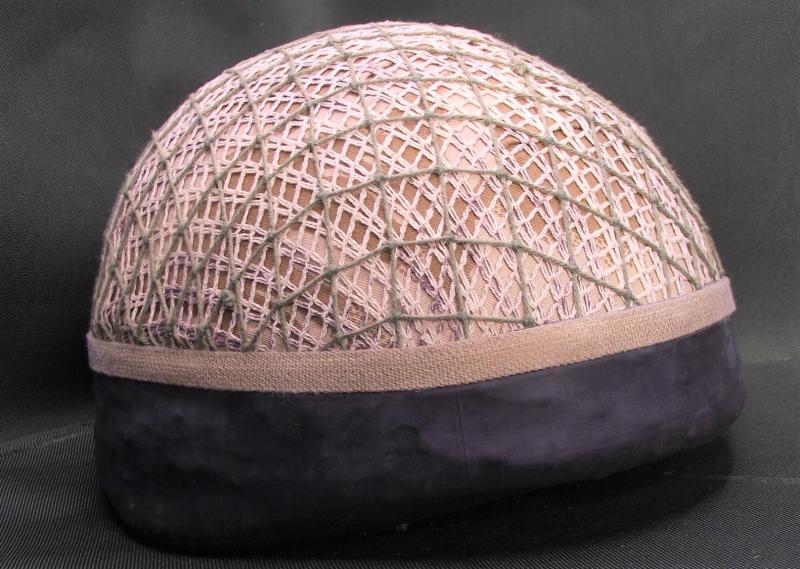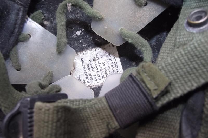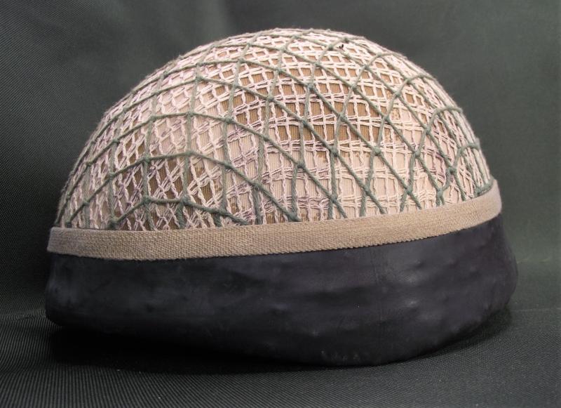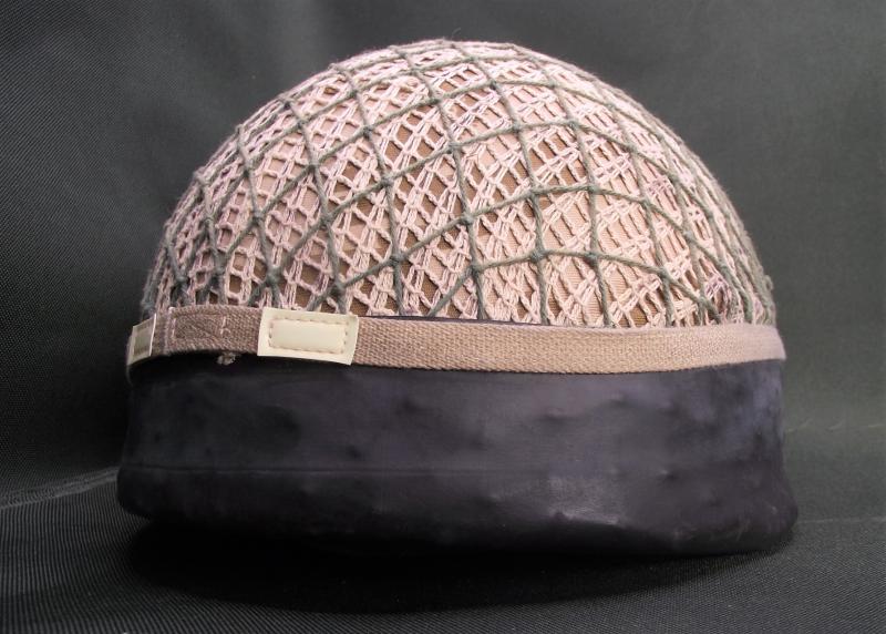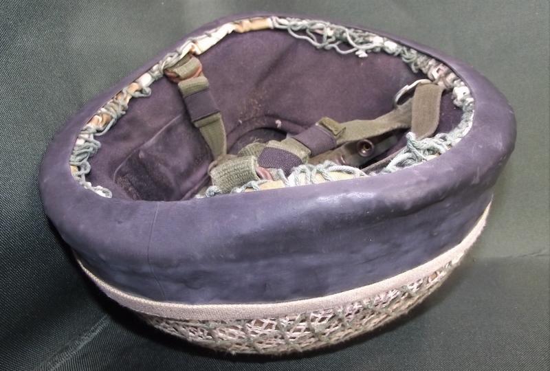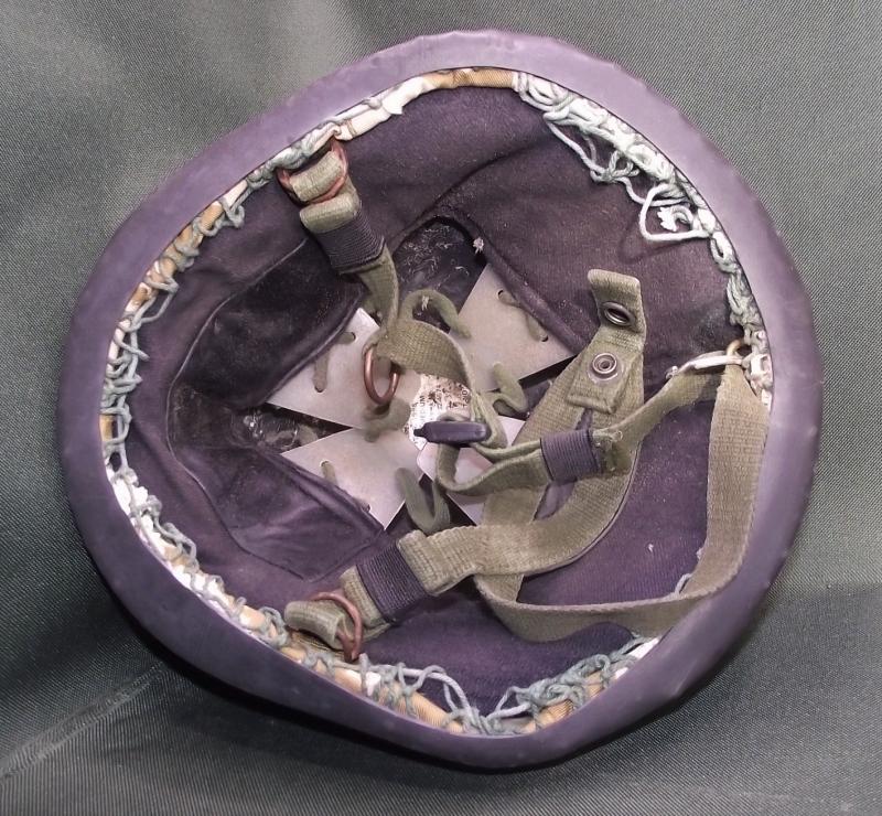 Helmet has a desert camo cover with two added scrim nets and rubber bottom. The inside has its liner and chinstrap system with the usual verdigris found inside these older para lids. Clear label to the inside crown.
