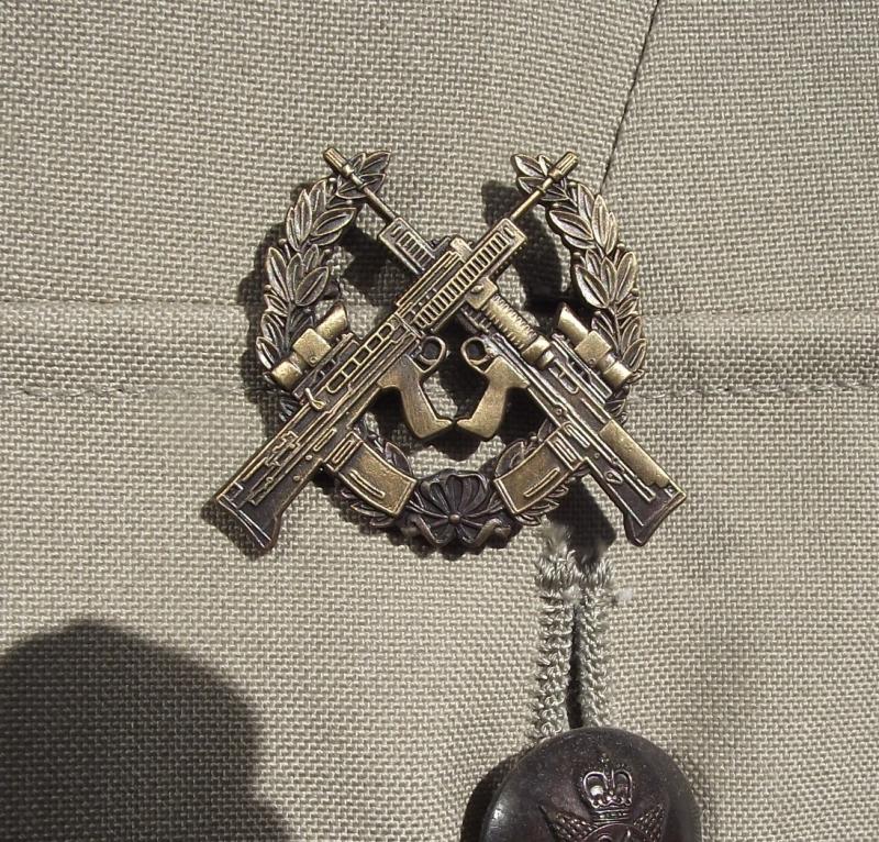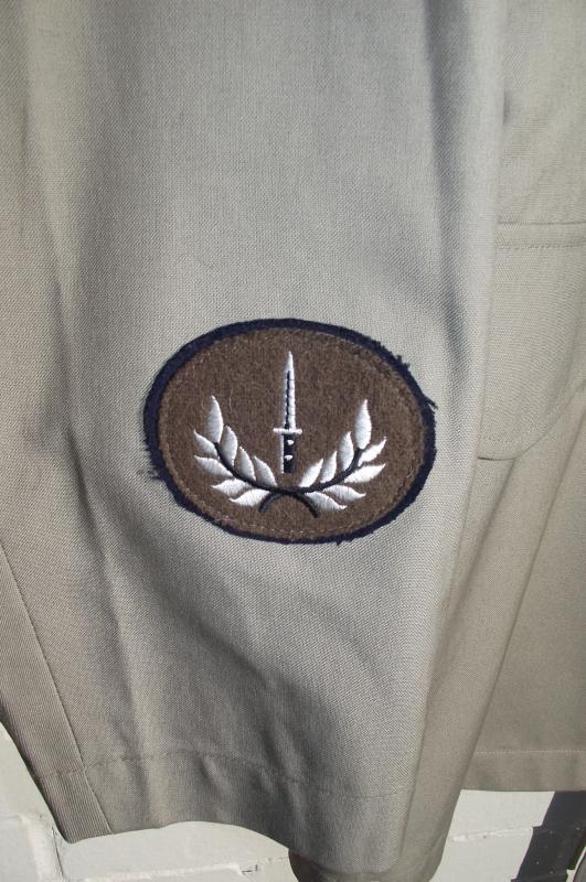Nice clean jacket with medal ribbon related to the Afghan conflict. Jacket is untouched with formation patches and above one pocket the Marksman metal badge. Inside label is present with full details. No other details found. Jacket comes with its belt but no buckle.