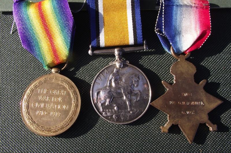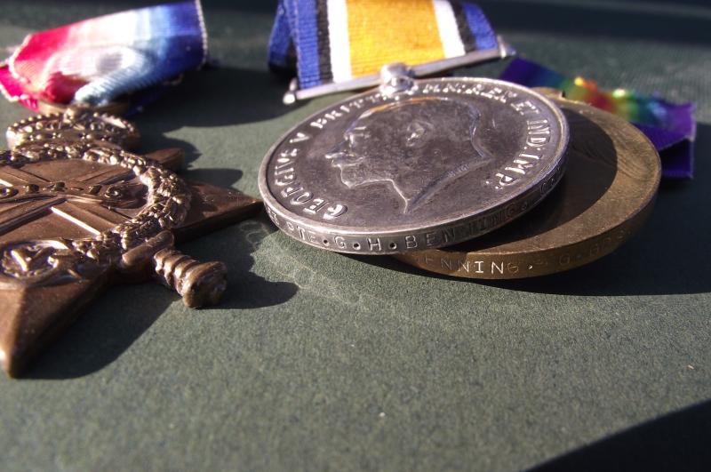 Medals are in very nice condition, no edge knocks,ribbons are stapled to a backing card, as found so will leave as is. Medal details are....21153 PTE.G.H.BENNING.G.GD.