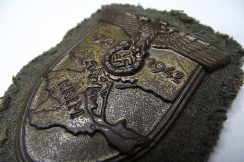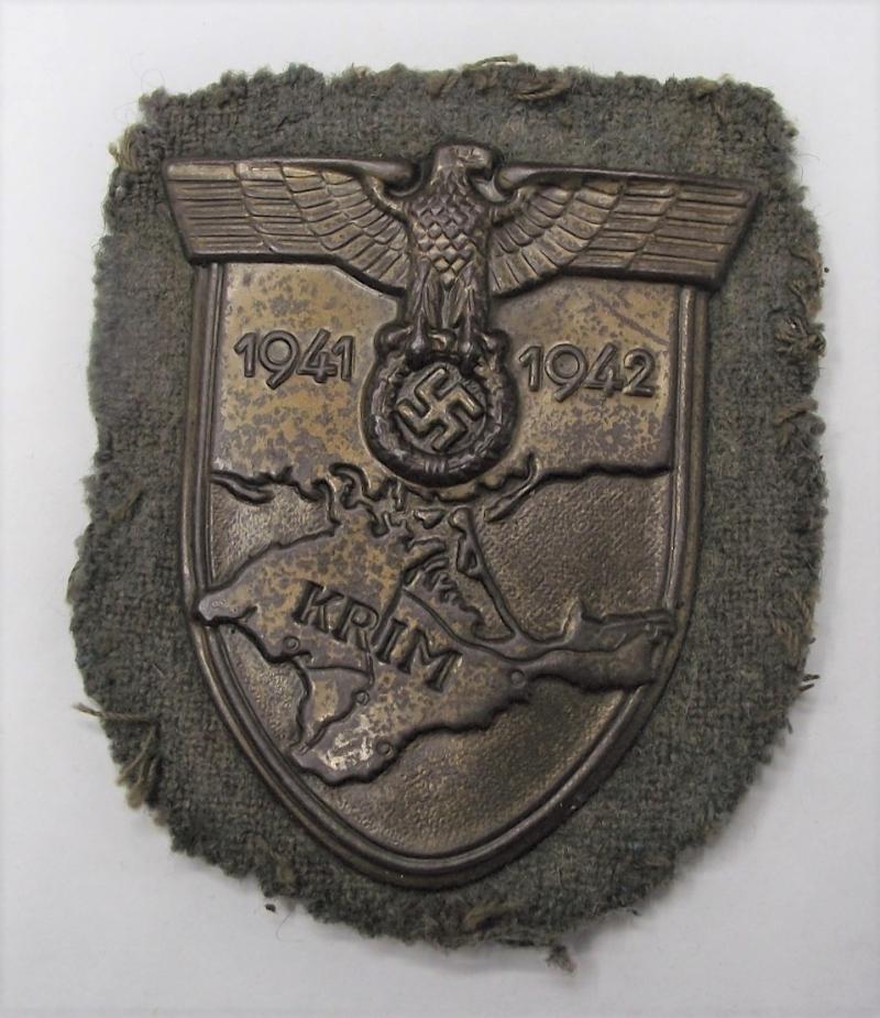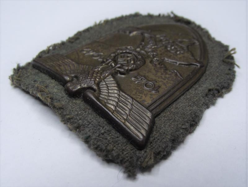 A very nice uniform removed example with over to 75% of its finish intact, sharp detail to the design. The rear has its metal backing and remains of the paper with all prongs. The Army backing cloth is complete with a good amount of wear and the remains of the thread used to sew the badge to the arm. Super uniform removed item and just the way i like them.