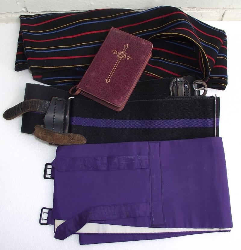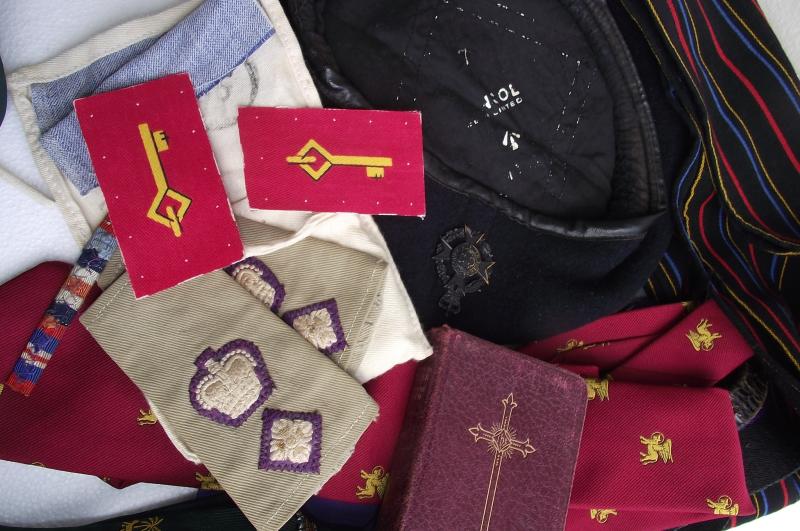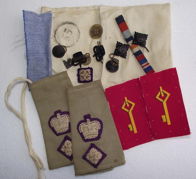 Nice little group of items belonging to a military chaplin. Beret is nice and clean with an officers cap badge, badge has been stiffened at the back using what looks like a wooden handle used in ice lollipops of the time. Also found is a pair of Chaplins KD rank shoulder boards, belts, college scarf, bible and his housewife contains a few bits of insignia including the unissued printed formation patches and his WW2 medal ribbon bar. Im sorry to say there is no name but found in the bible are a couple of small newspaper cuttings with names etc so there might be a chance. Anyway not a bad little selection.