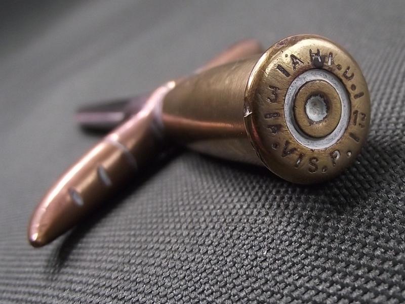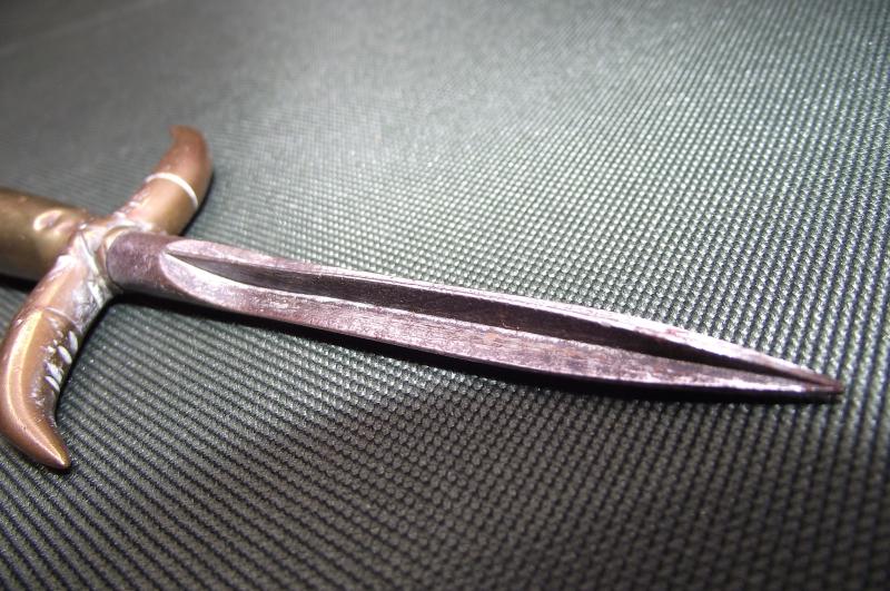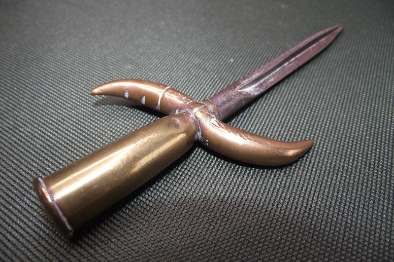 Nice souvenir using a bullet case and spent heads for the handle and what appears to a aerial Flechette for a blade. The front end of the flechette slipped inside the bullet cartridge and the rear having been filed down to form a point.