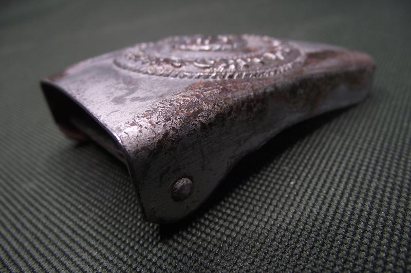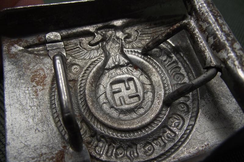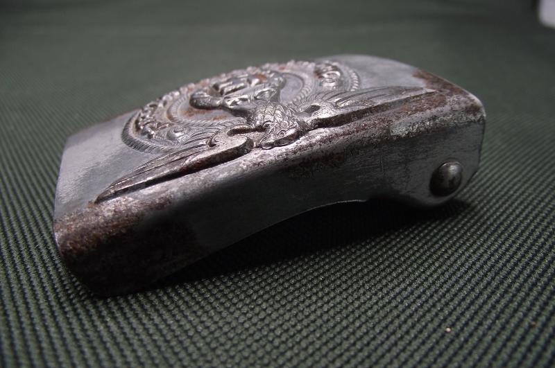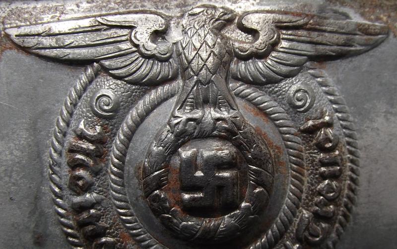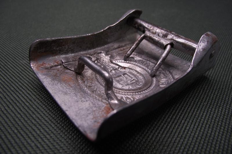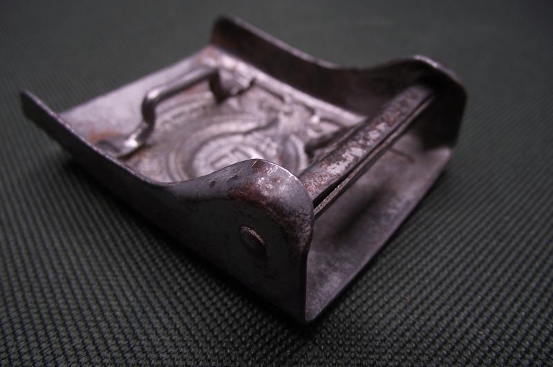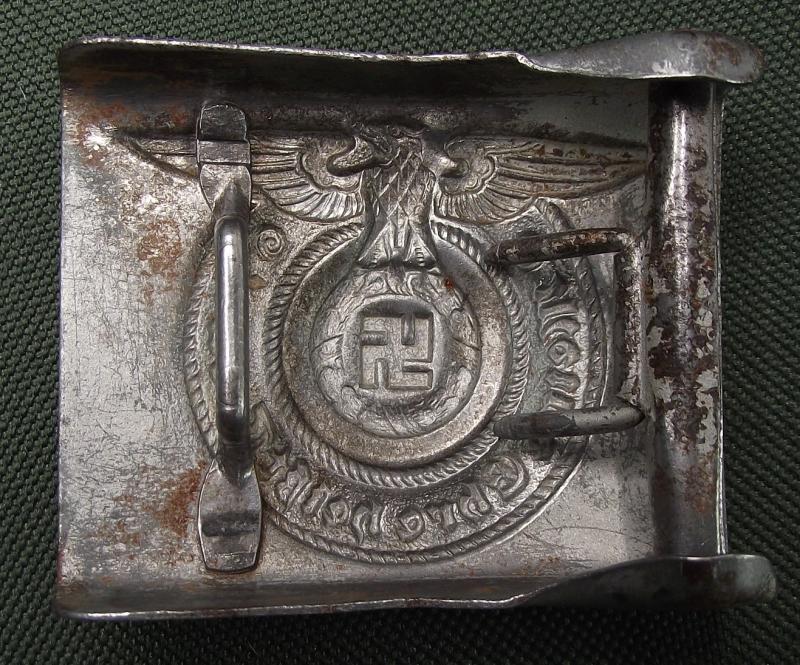 Unmarked late war steel SS buckle manufactured by the firm Overhoff. Buckle has a good amount of its period finish with the top and bottom outer edges down to metal with a certain amount of patina. Details are sharp. The inside has both fixing prongs and catch with over 75% of its finish.