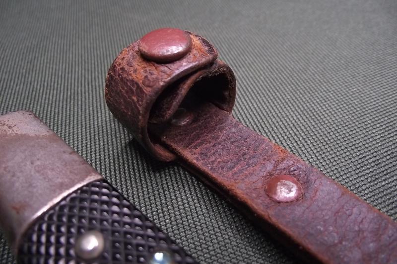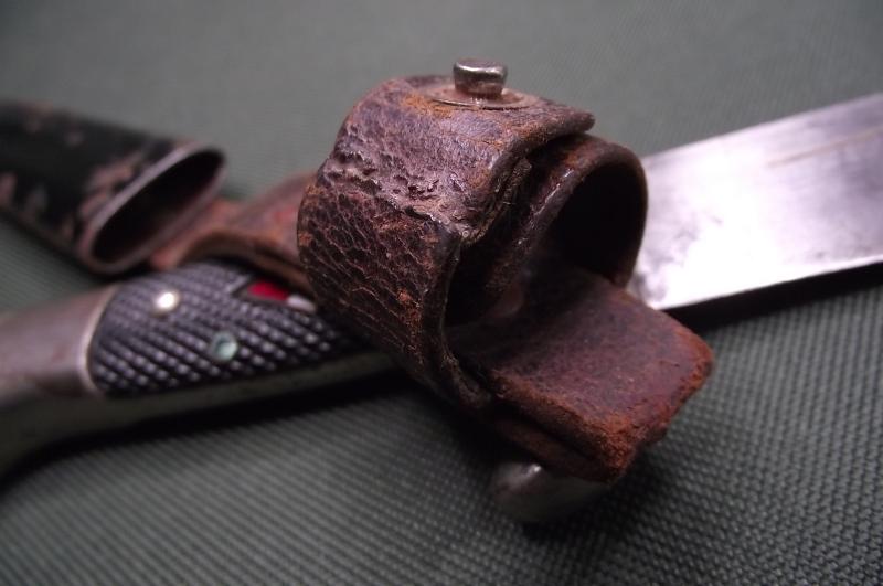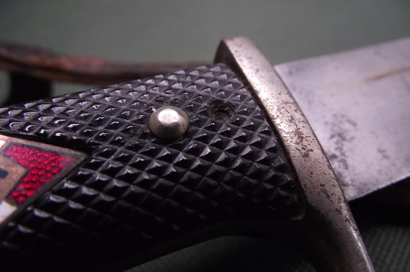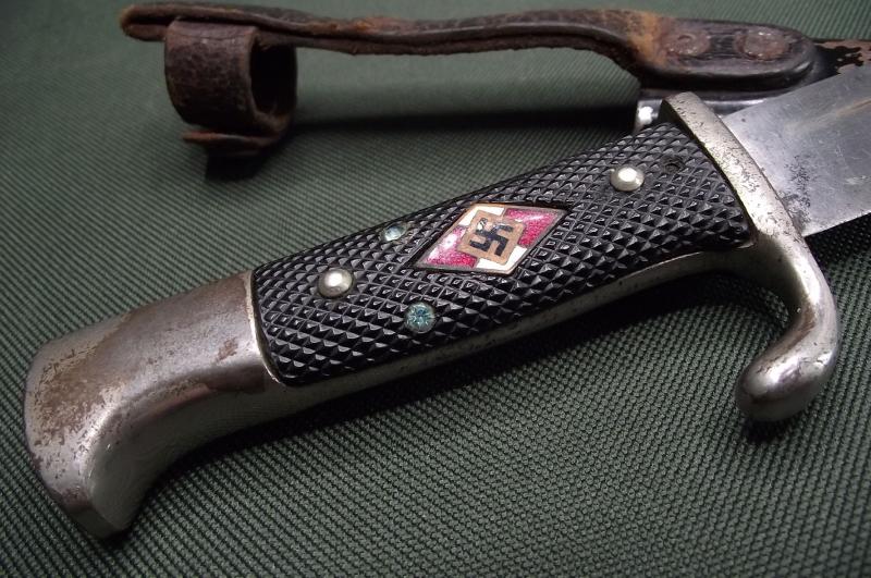 Blade is complete with minimal sharpening and staining, makers stamp is very clear with the Blut und Ehre Motto having faded but still visible. Blade leather washer is missing. The handle has no cracks or chips with the central membership badge moving slightly in the grip which i do like to see. At some point the handle has had three stones professionally added, one is missing leaving to view the drilled area where the stones where added. Pommel and cross guard has most of its plating present, missing as usual to the side where the closer strap rubs. The steel scabbard has around 75% of its period finish, top leather hanger and a repaired working top snap strap. As for the addition/personalization, its my opinion its wartime done, im sure that any postwar work would have some sort of denazification to the diamond. But thats only my opinion folks!