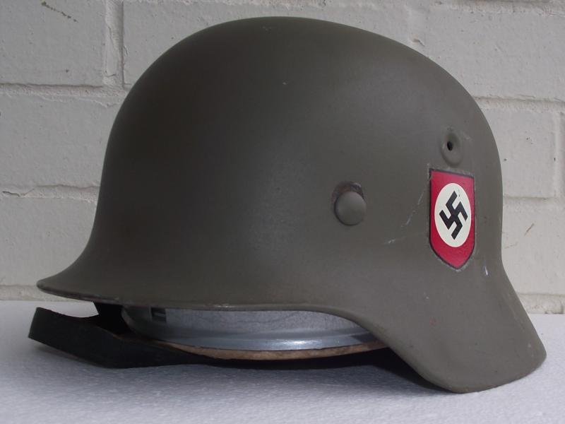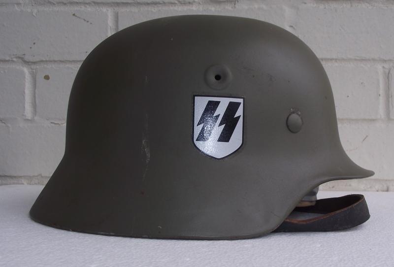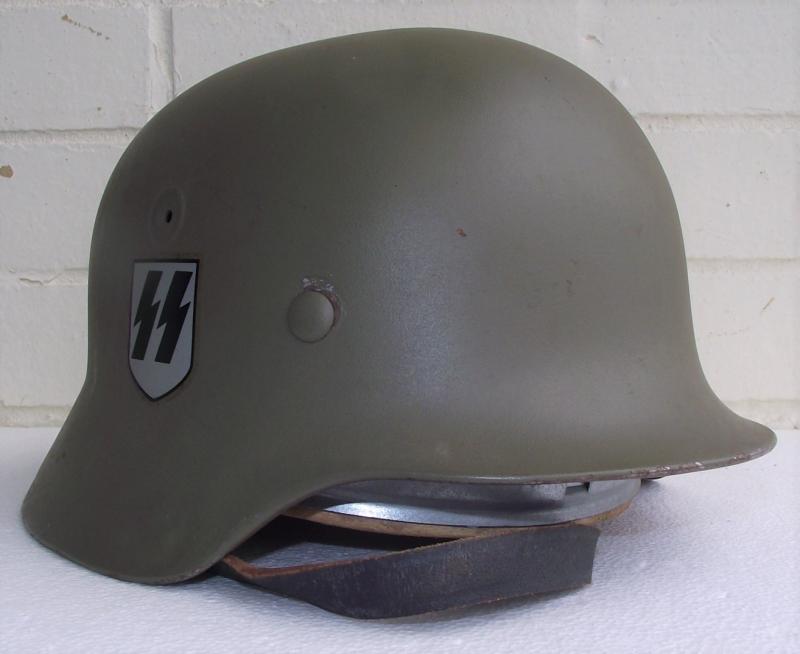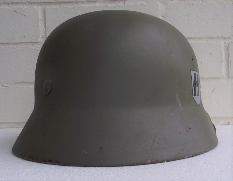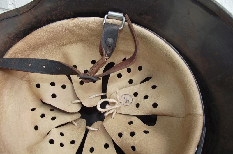 At some point i believe this helmet was purchased by Finland going by the paint. The M53 shell is solid without damage and has had two repro decals added. The liner system is a reproduction of a wartime example with both front liner pins being the M53 type that need bending to secure the liner in place, back pin is tight. Chinstrap again a reproduction of a wartime example. No stamp markings found on the shell but going by the liner stamp 56 this would correspond to a good size 64 helmet shell. Good project and would suit if you had a nice camo cover.