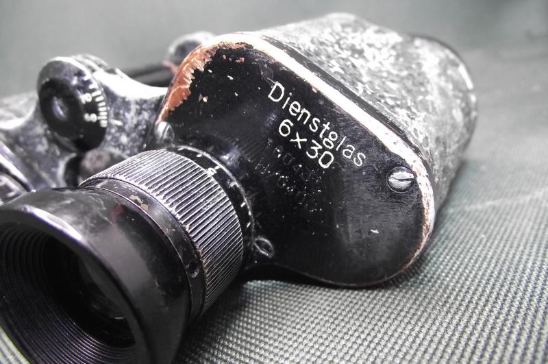 A nice well worn set with clear end cap markings, ''fvs'' over ''KF'' on one side the other being ''Dienstglas, 6x30 160437, 11/6400''. Its my understanding the ''KF'' stamp is for the type of grease used during winter conditions perhaps dating this set to around 1941. The optics have sharp clear focus, one tiny growth can be seen to one lens only. The aluminium body has a nice amount of factory black remaining, leather body cover is well used, complete and not the best factory application when it comes to fitting. Good set and an unusual maker to find.