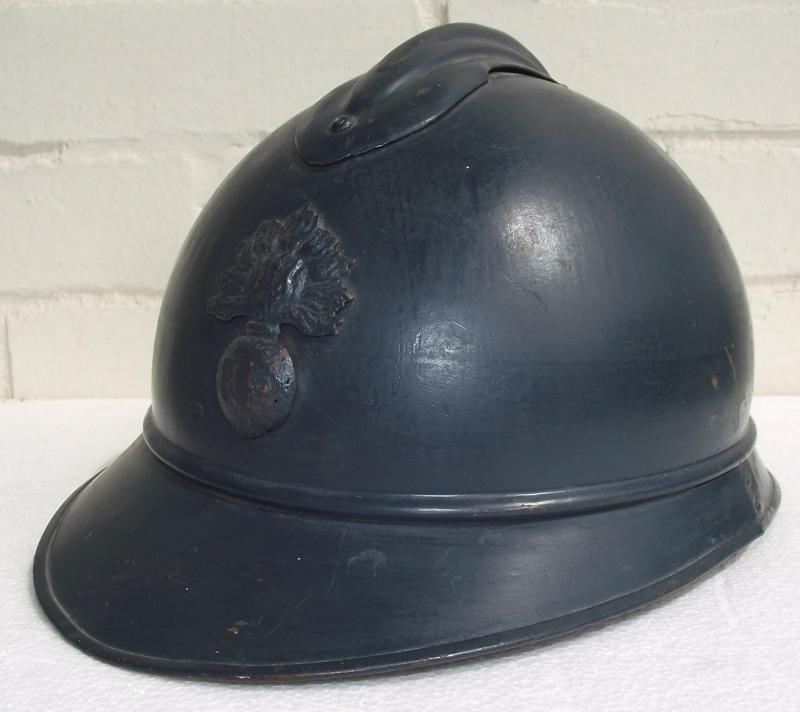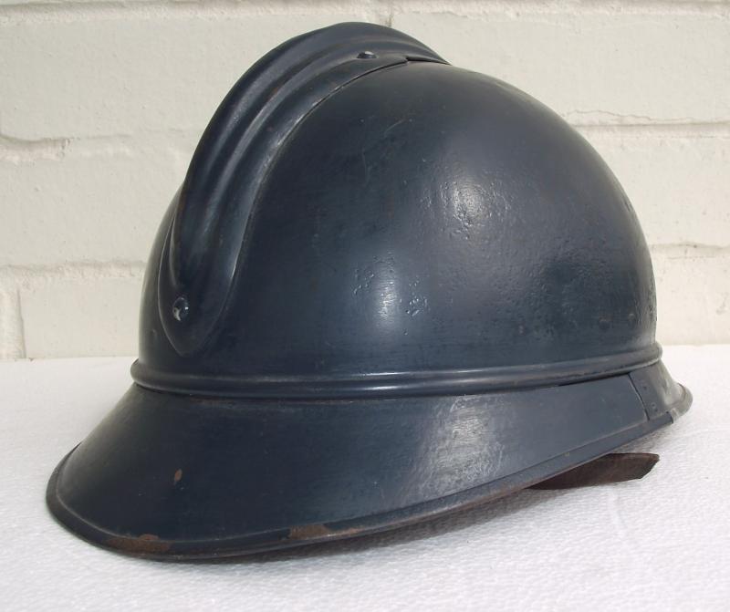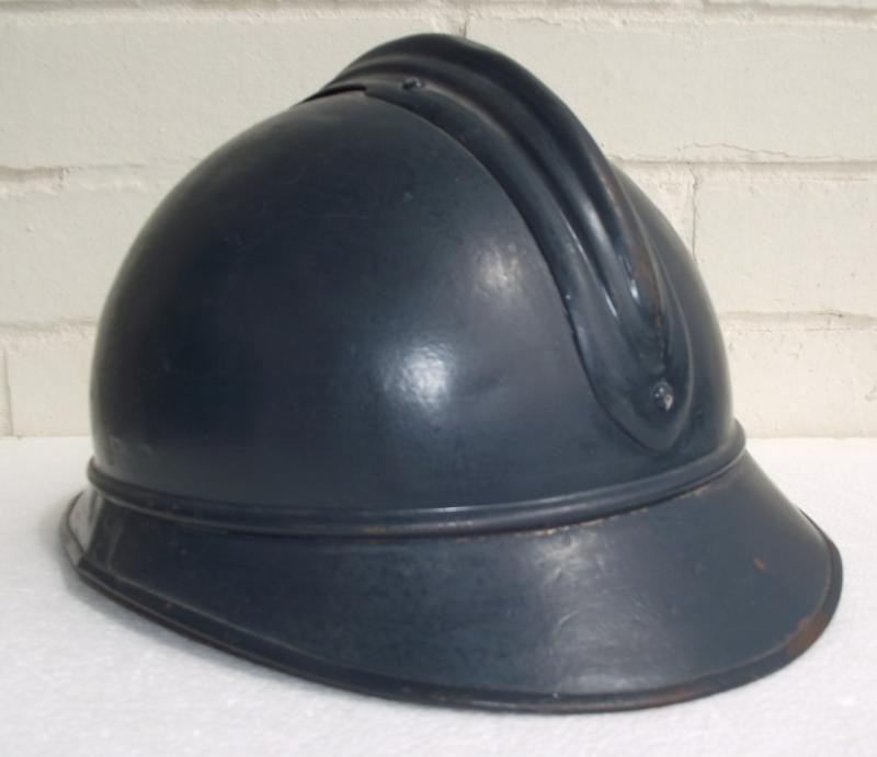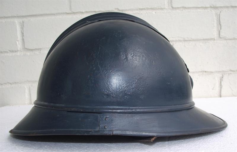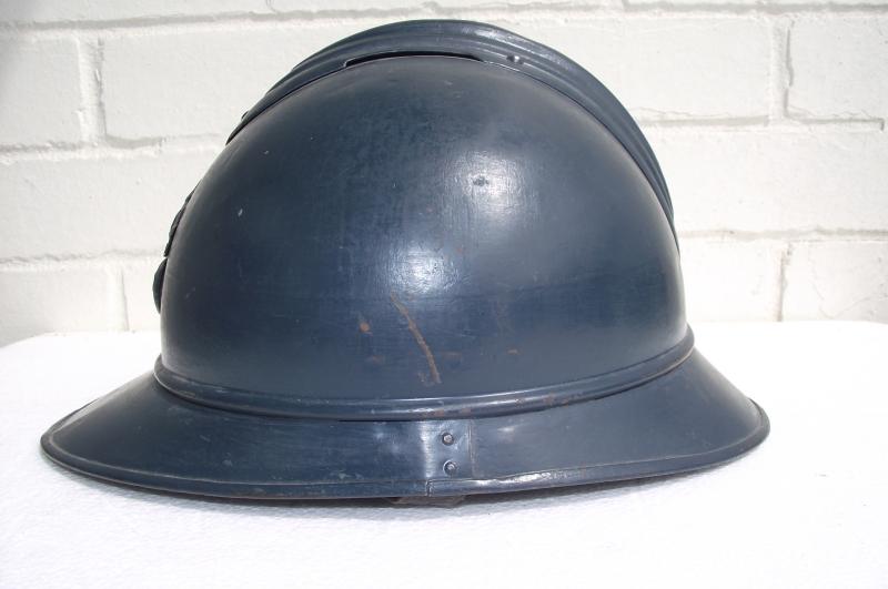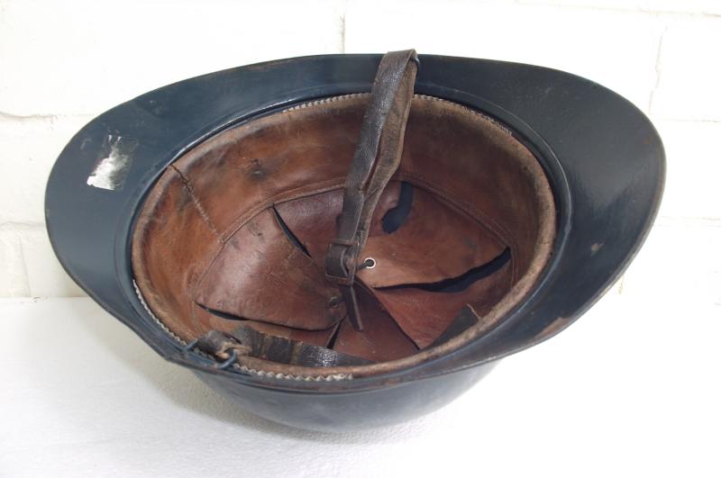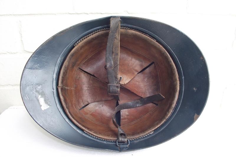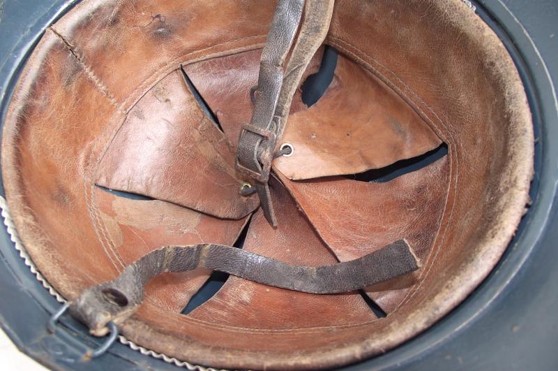 When i purchased this M15 in a box of others i didnt realize the shell had been repainted until closer examination, not sure when but has some patina. Someone did a very good job with the blue finish, the badge is a ''give a way'' seeing the rust under the paint as seen in the pictures. The original liner system is complete with corrugated side panels and supple leather, chinstrap has come apart at the center. Great display item even with this re-paint.