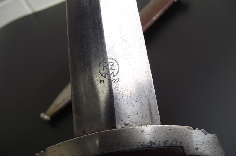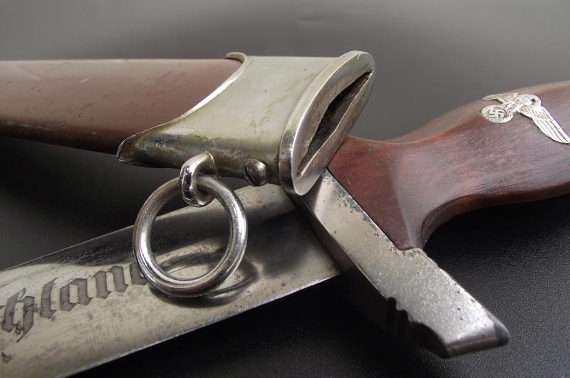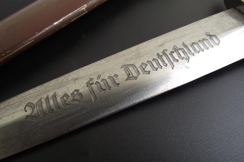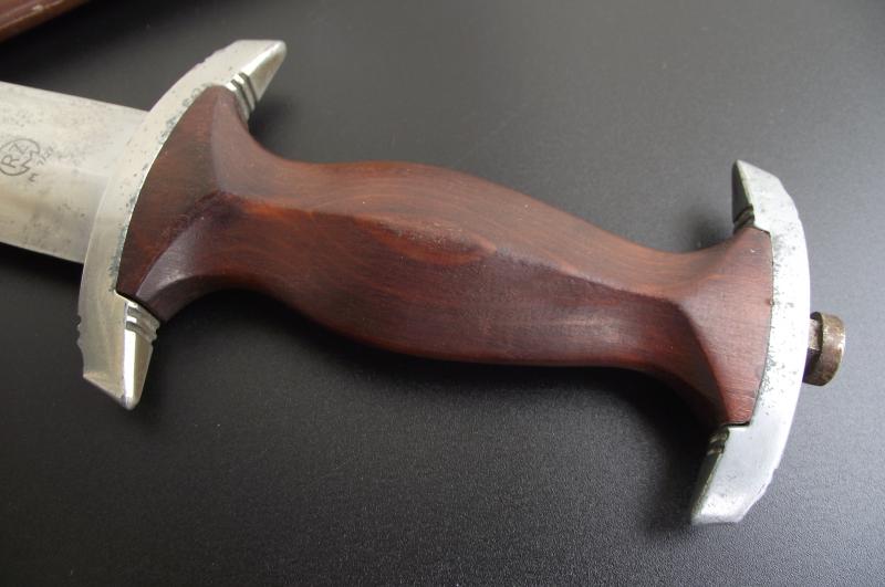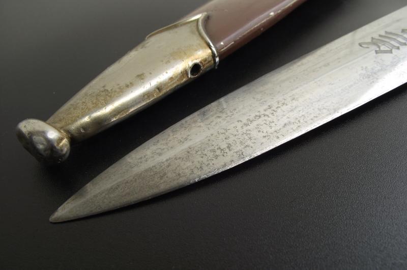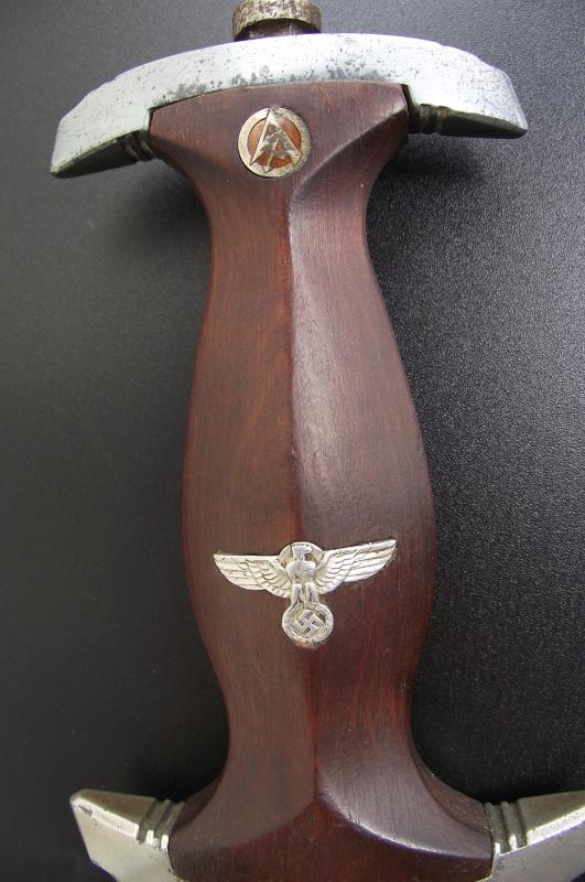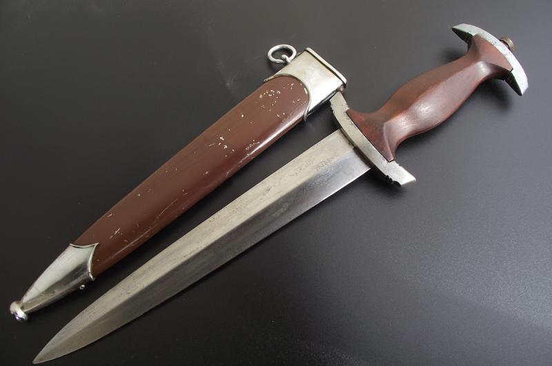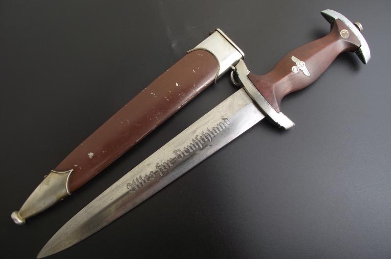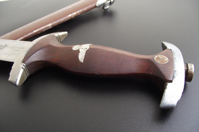 Late manufactured dagger by Pumawerk. The blade has some faint staining to the surface and the usual runner marks, blade cross grain still evident. Motto and makers codes are crisp. The hardwood handle is close to perfect condition with no chips, cracks or stains. Bright nickle eagle with some staining to the SA roundel. Cross guard fittings have some plate lifting as has the tight top nut. The scabbard has close to all its period finish with scratches from storage. Plated scabbard fittings have some wear, bottom ball just a slight knock, missing one screw and the two top screws are replacements. An above average example in my opinion with the main issue being the replaced screws.