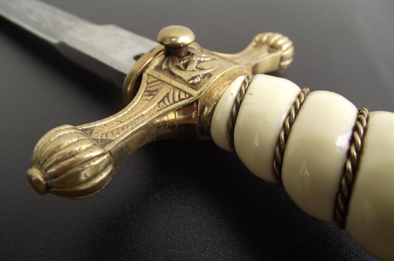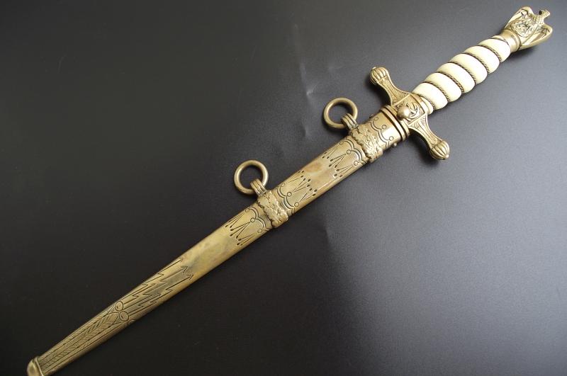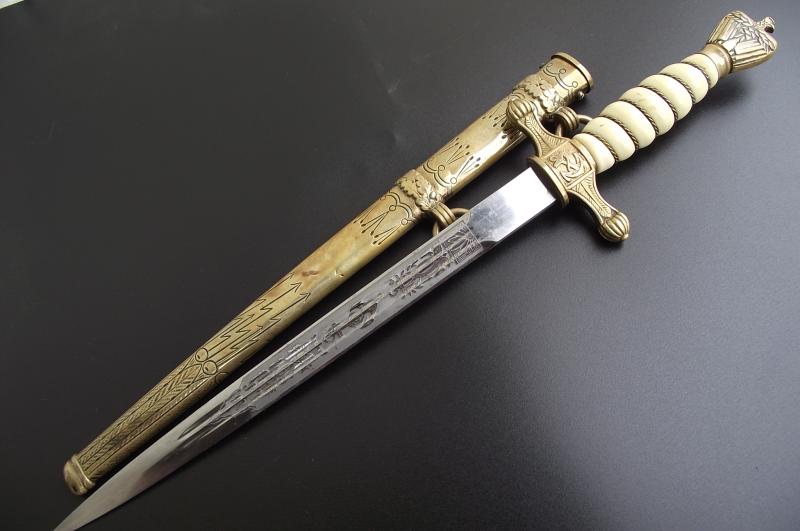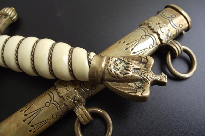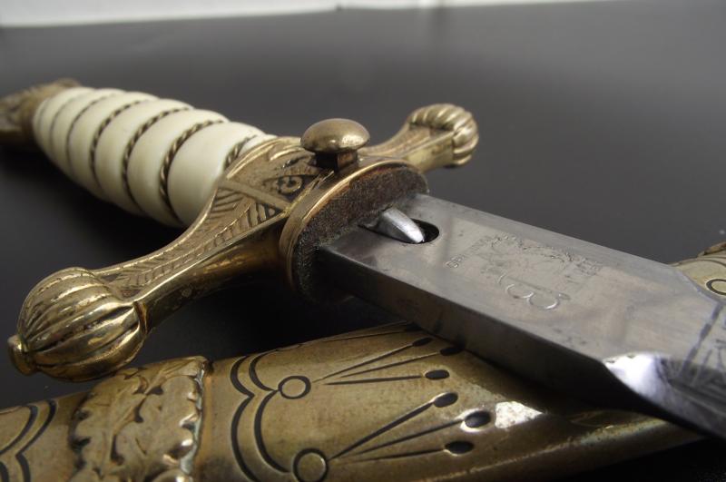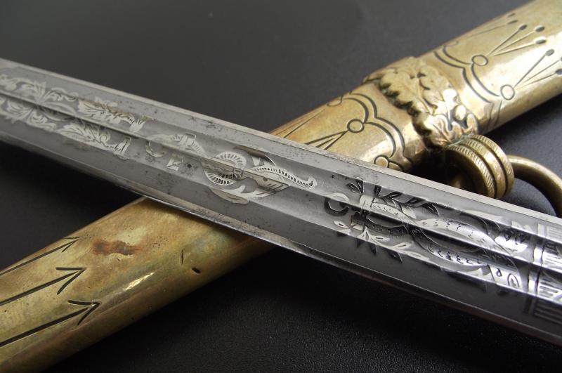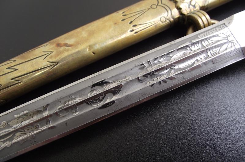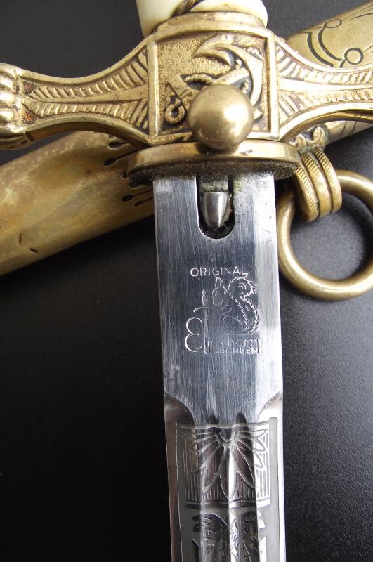 Blade i would not rate as in mint condition but its ''close-ish'' with both etched panels having sharp detail and a nice amount of gray background. Just a couple of light surface spots. Tip still has its spear point with the bottom of the blade having its sharp Eickhorn trade mark. Blade still retains its leather buffer. The cross guard has close to all its finish including buffed highlights, pommel has good finish with a certain amount of wear to the top and sides. Fixing button in tight working condition. The celluloide single wire twist handle is in very nice condition with no cracks, chips or splits. The brass lightning bolt scabbard has a couple of minor knocks with plate lifting to the central section and one knock to the bottom ball section. Both side screws are the period examples and are unmolested. An excellent example for sure.