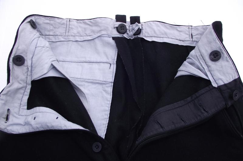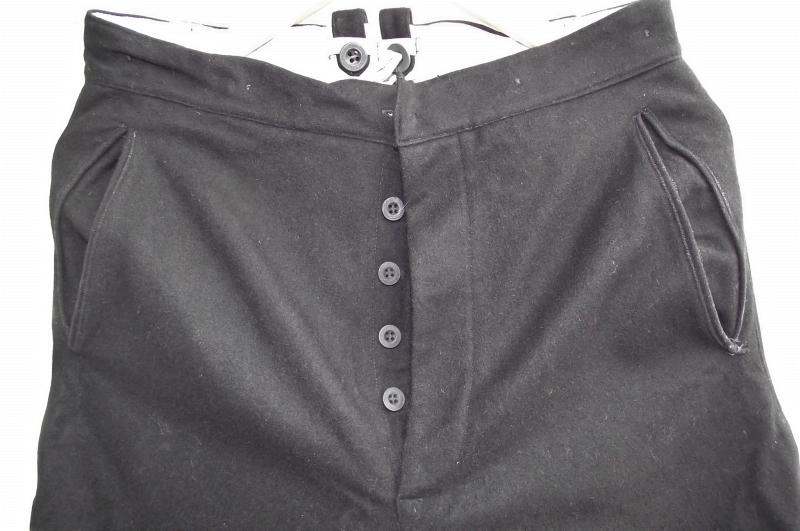 Condition is very good with good nap to the material and no moth holes only slight staining from storage over the years. All buttons present to the outside and inside. The bottom side zips work fine and are ''PRYM'' marked examples. No label to the inside to be found. Buttons are marked '' SOLIDE ELEGANT. From the same source in Koblenz as the other ''Youth'' trousers im listing. The color of the material is black rather than dark blue that would suggest these being work by a DJ leader as seen in many photos but without a label and the buttons not being HJ/DJ marked examples i can only speculate but im sure im in the right ''ball park'' . As for sizes these will be approximations only. Top to bottom..36 inches, across the waist laid flat...just over 15 inches. Although not textbook if your into collecting ''patterns'' only, this period pair would make a great display item with any HJ/DJ leaders outfit!