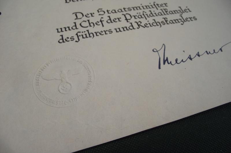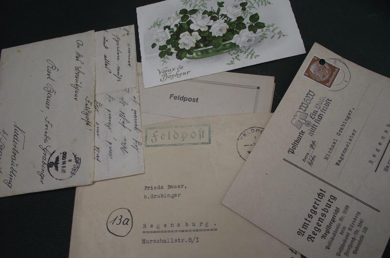 The 25 year Service document is dated 1939 and is in nice condition. Also included is a promotion document dated 1944 and a congratulatory letter from a local Reichsbann President on his 25 year award dated 39. Also come with three feldpost related to the family.