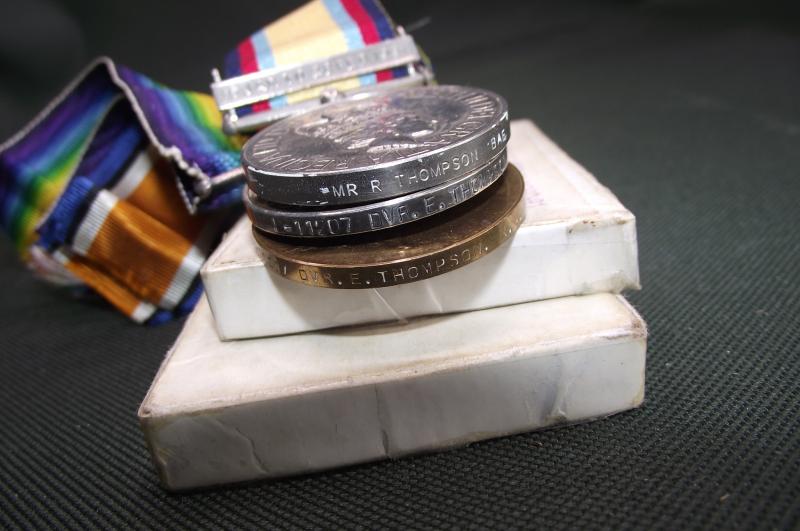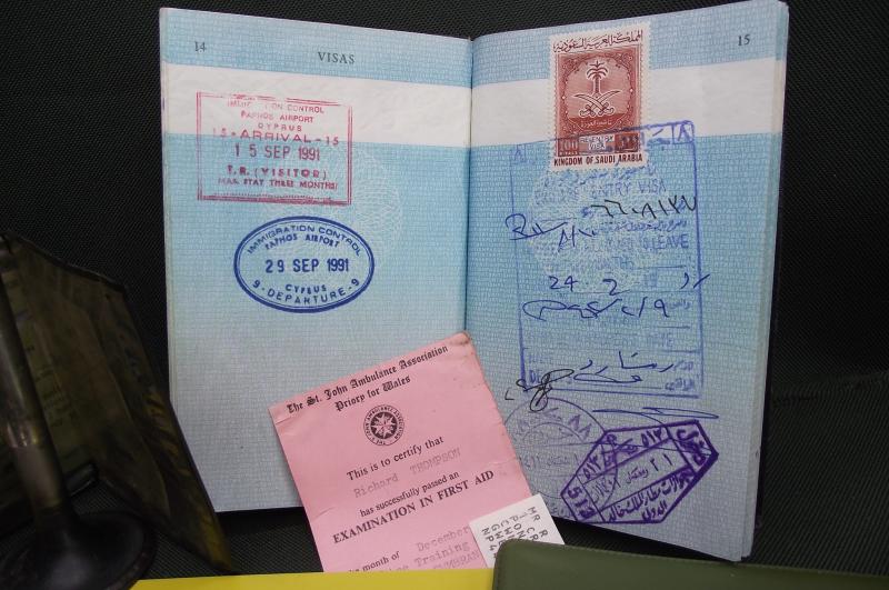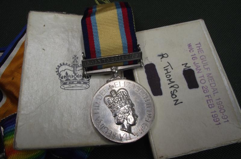 The Gulf War medal relates to an ex RAF member and Police officer who worked for BAE systems during the conflict. The boxed medal has his details along the edge...MR R THOMAS BAE, details also found on the back of the medal box. This comes with the gents passport , all stamps relate to visits in Saudi Arabia in the 90's, his police federation card for South Wales dated 79 and his personal ''skilled at arms'' booklet dated 1987 from his time serving in the RAF. The other ''bits n pieces'' all relate to his service during his time as a Police officer, RAF service member and time in the Gulf. Also found was a WW1 pair to his Grandfather that are also unmounted and in very nice clean condition. The details around the medal edge states...L-11207 DVR E.THOMPSON R.A. This little group i purchased off the son last week in the Cardiff area.