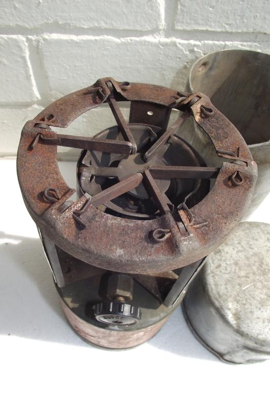 In well used but rather complete condition with good color and printed details. The outer bottom container appears to have been used for cooking going by the burn marks to the bottom. Bit smelly as ive had to drain the contents from the tank. Cooker would really clean up well with some warm soapy water.