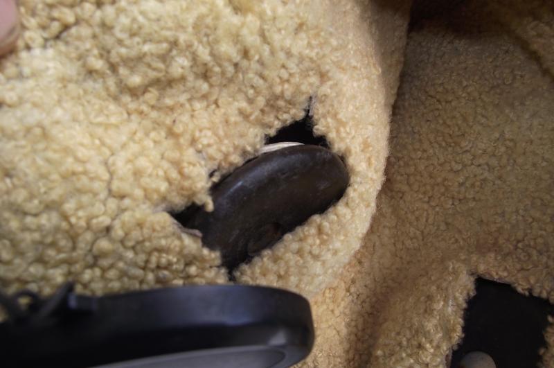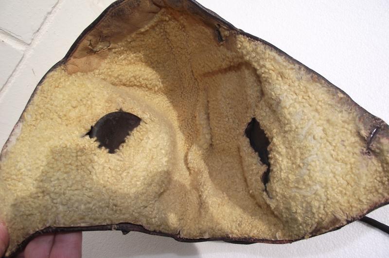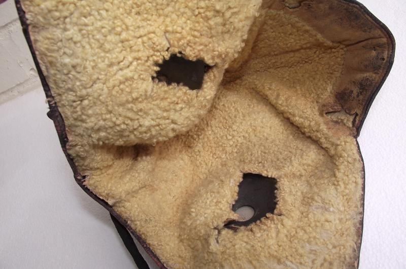 The leather body is in supple condition with no loose seams or stitching, both back straps are present , i have not tried to lift the poppers. Both side tabs present with buttons and top webb stretcher present with back buckle. Both bottom leather straps have some wear with both fixing buckles present. The inside fur is complete and clean but both side openings have torn revealing both receivers with the period loom still attached. No label to be found inside. A good displayable example.