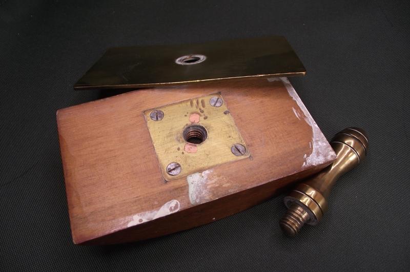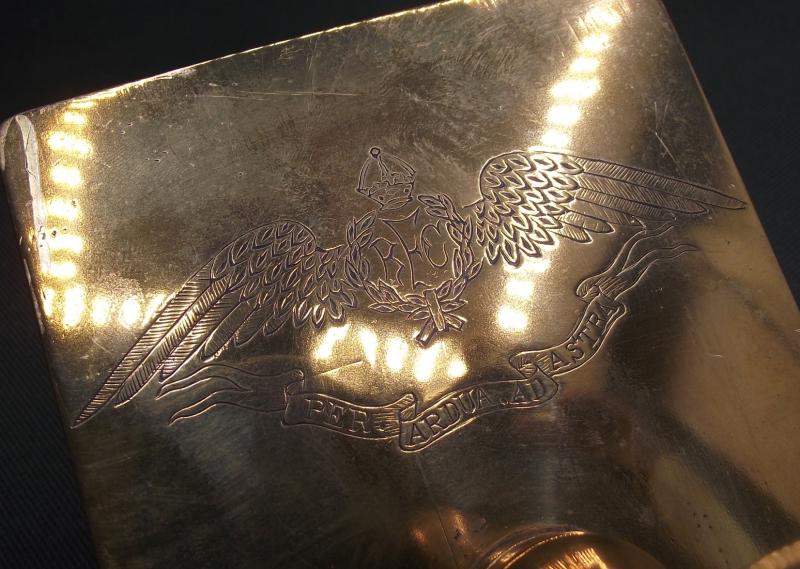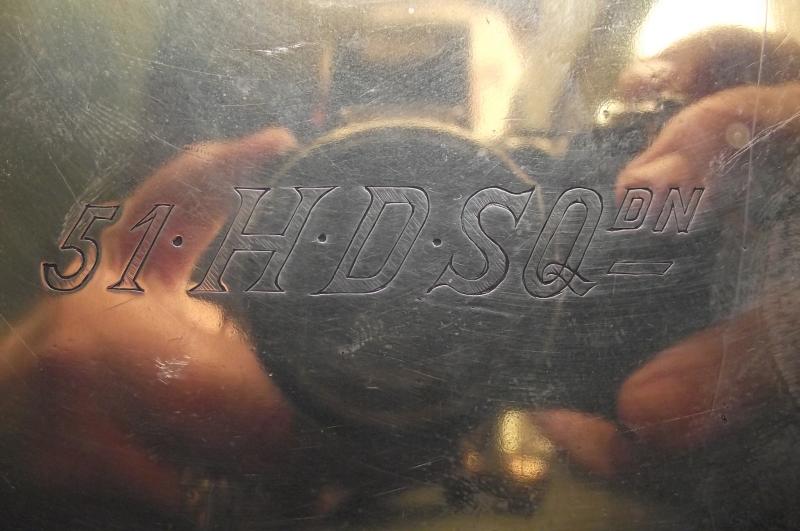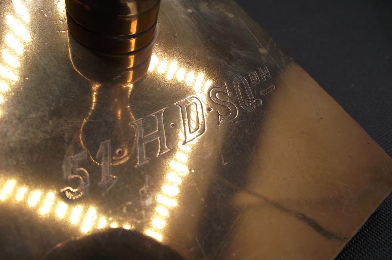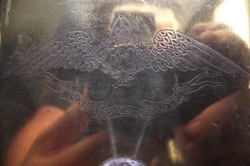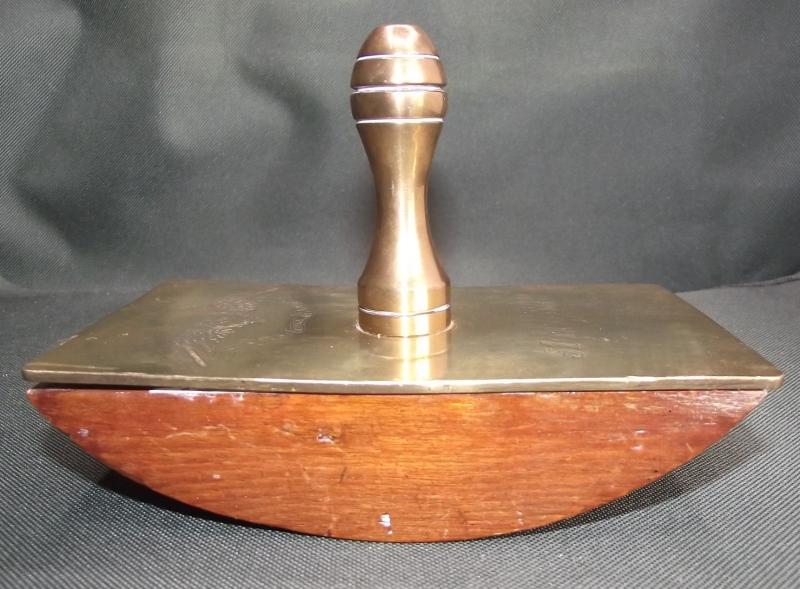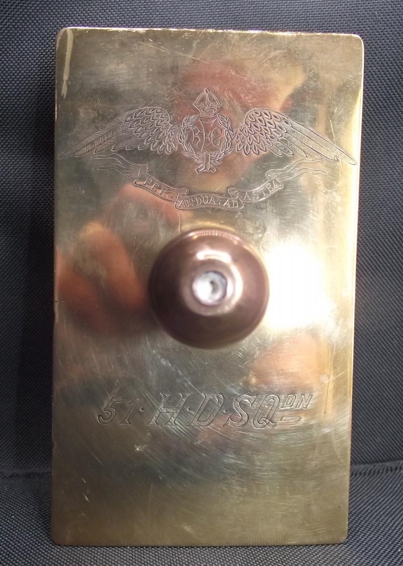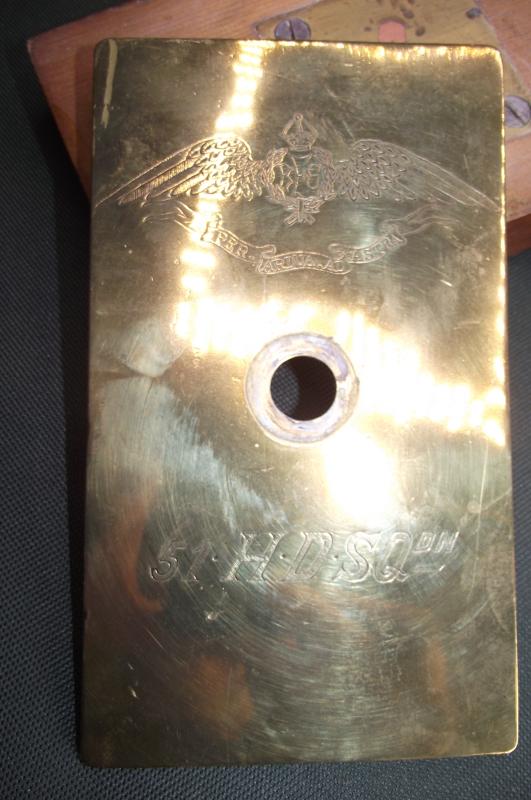 Very nicely produced ink blotter made from worked brass and in my opinion part of an aircraft propeller. The hand etching is very well executed with a great set of RFC wings to the top of the plate, underneath states...51.H.D.SQdn. The brass turned handle screws off to allow the blotting paper to be fitted, its been used by evidence of the ink marks to the wood. 51 squadron where a Home Defence unit used to protect the UK from Zeppelin attacks.