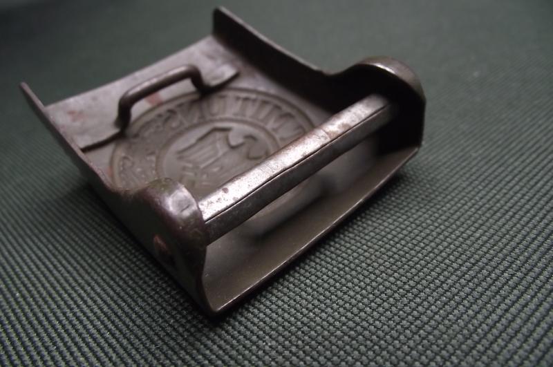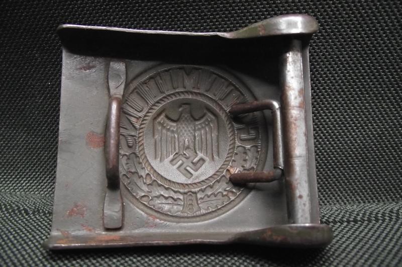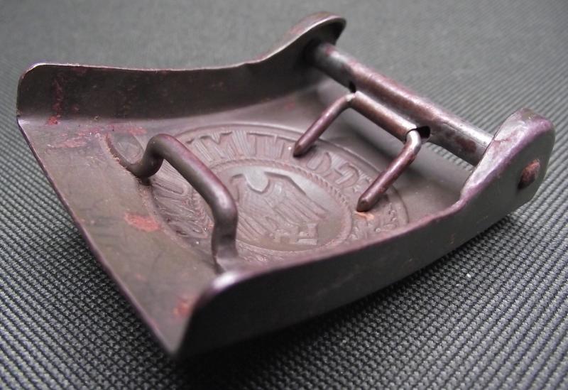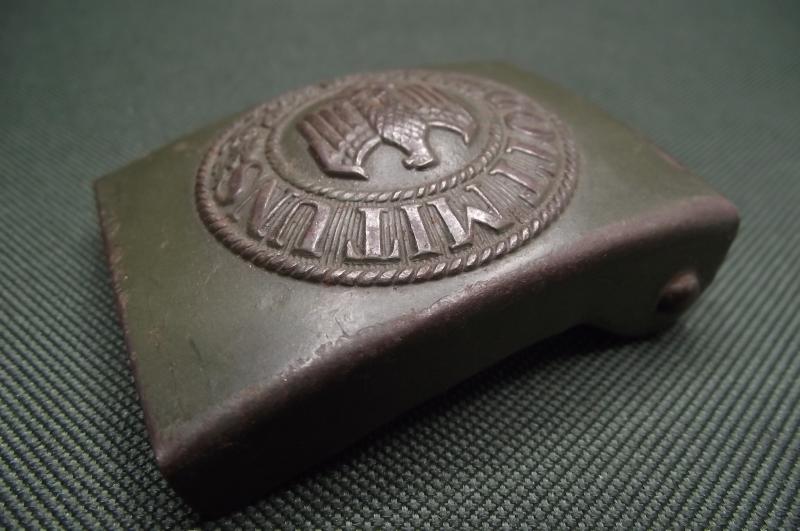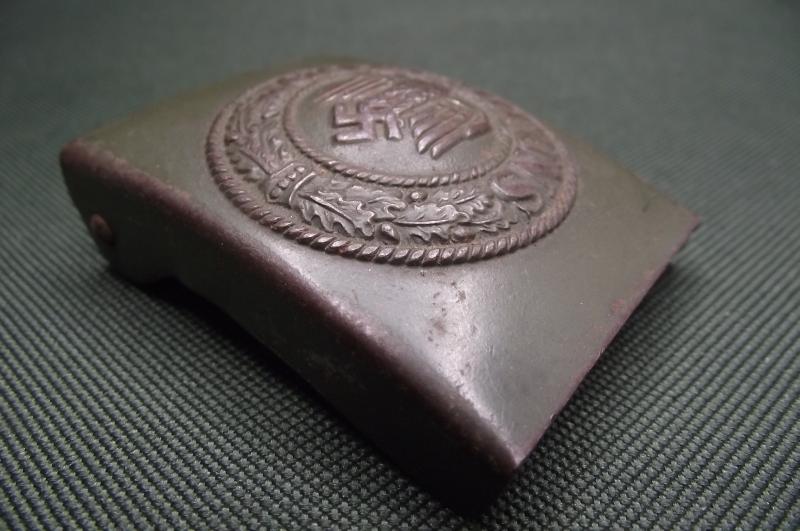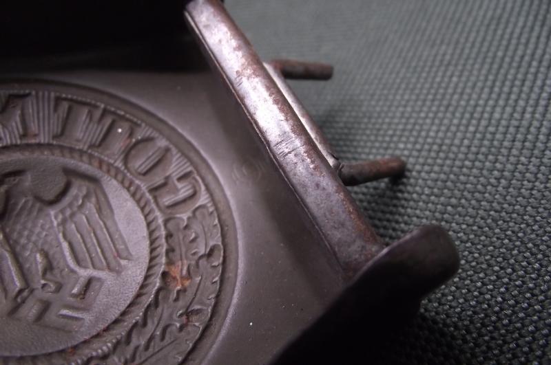 Gustav Brehmer produced steel buckle with close to 100% of its period green factory finish except for the highlights as expected for an example thats been worn in the field. Just under the back fixing prongs and bar is a clear stamp ''GB'' above a ''40'' date. Its my opinion t with a little search on the internet these 40 dated GB buckles are usually found to have been worn by DAK troops in North Africa.
