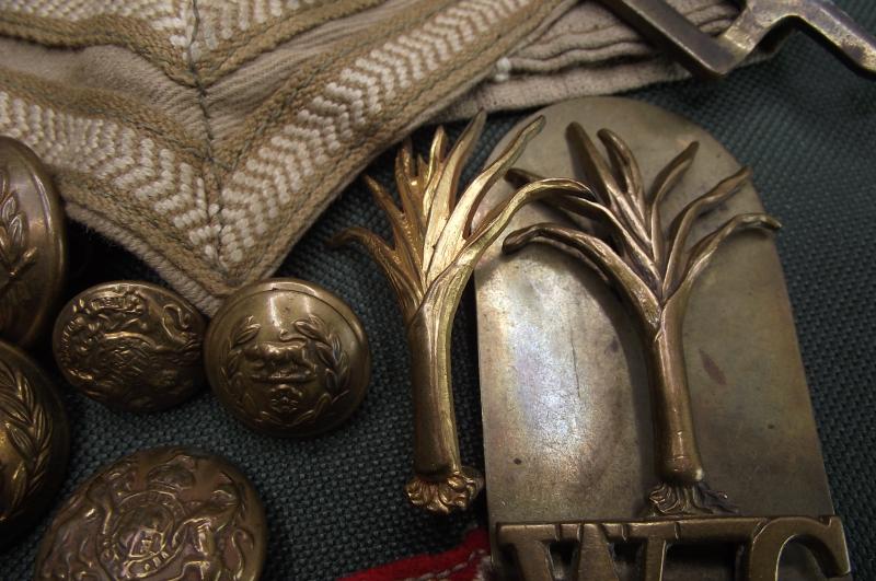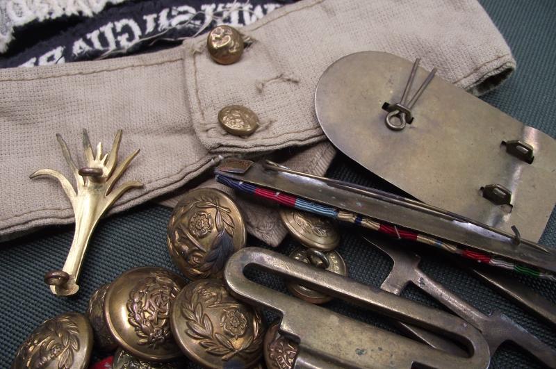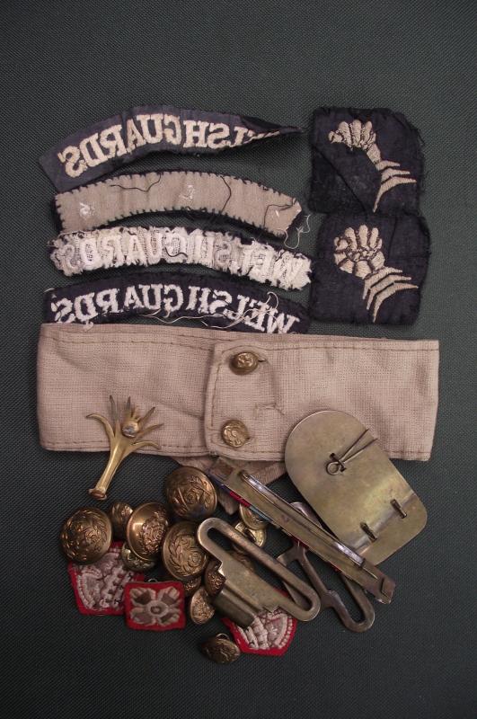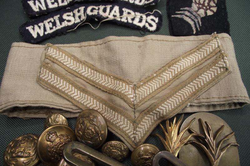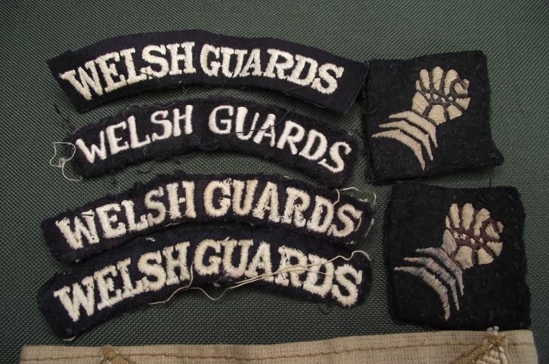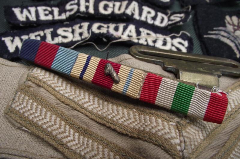 Small grouping that belonged to a veteran who served in the Welsh Guards during WW2. There are four titles, all different but the bottom two i would say are worn as a pair, uniform removed. The 6th Armoured patches are mismatched but looking at the matching condition and the remaining thread they do look like the pair he wore on his BD. The ribbon bar shows he was one of the first in North Africa and then went into Italy, the KD stripes would match for both theaters. Found also was the WG cap badge and metal shoulder title , lastly a number of buttons and officers pips? This little group ''came in '' last week with the name given as Mathews who lived at Taff Mead Embankment, Grangetown, Cardiff.