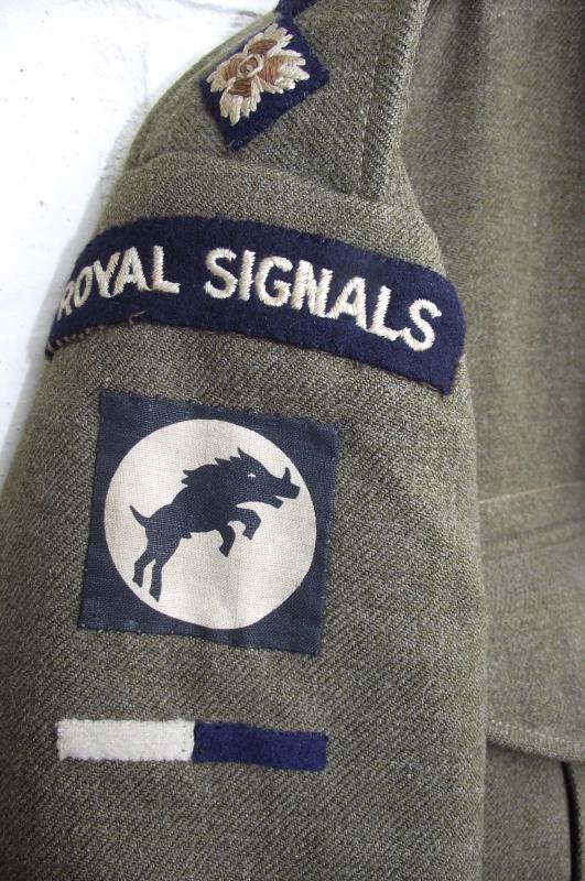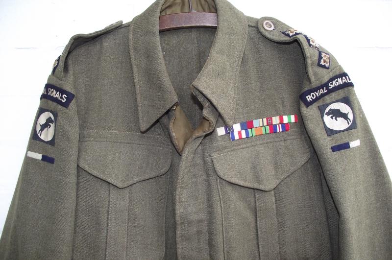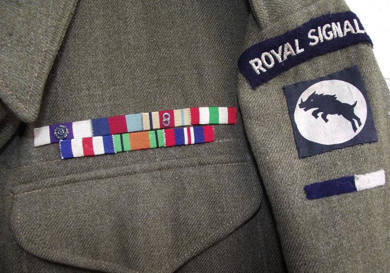 This jacket was purchased by a friend from the family who decided to sell after the bereavement of a family member. I have been chasing it for over 8 months, my friend was promised Fields medals and he wanted to add them to eh BD, I was put on the ''back burner''. Last week my friend was informed by the family that they had sold the medals through an auction house, hence i can now offer here for sale. Not being a researcher and not willing to pay i can find little on Fields service except one mention in the Gazette supplement dating 1941 and a mention from another source that field was awarded an MC in the Middle East , June 17th, 1943 whilst an acting Captain in 30 Corps, Signals. Now is this the first award or second? As we know 30 Corps had an illustrious and hard fought war from the early campaign in the Middle East, Italy invasion, D-Day landings and Operation Market Garden. Fields ribbon bar suggests action in all! A Battle Dress worthy of any collection and with super research possibility.