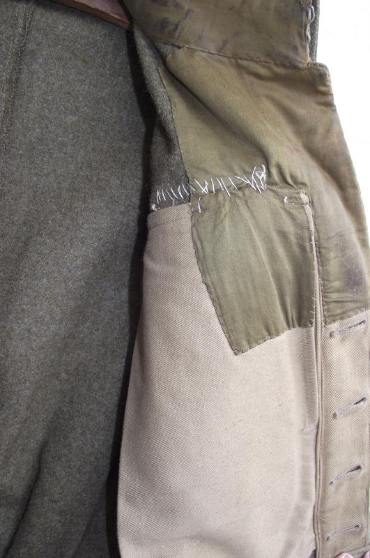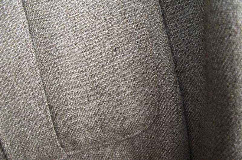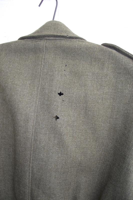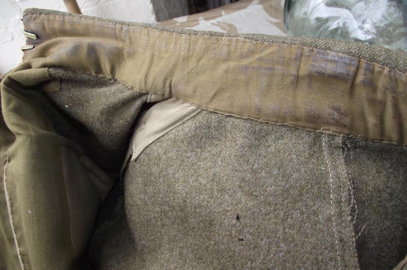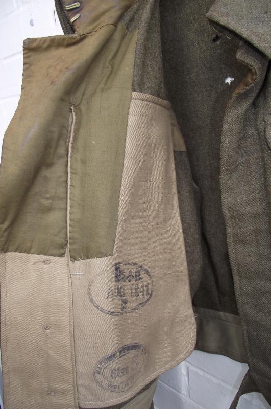 A 1941 dated New Zealand manufactured 37 pattern BD used by an officer, Albert Lawrence Field, who was part of 30 Corps Signals. The BD is in nice condition, its been used in the field, some grime to the collar area. Material has good nap with just a couple of tiny moth nips, hardly noticeable to the front. The back has some issues with one area having a couple of good chunks taken by moth, lets say much smaller than a 5p coin and an easy job if your good with a needle and thread. The area is stable and not weak. All insignia are period hand sewn and ''bedded'' into the BD material. The collar area has been opened up for officer use. Inside material is very clean with clear manufacture stamps. The collar area has some sweat staining from use as does the inner bottom edge. Ribbon bar is period applied.